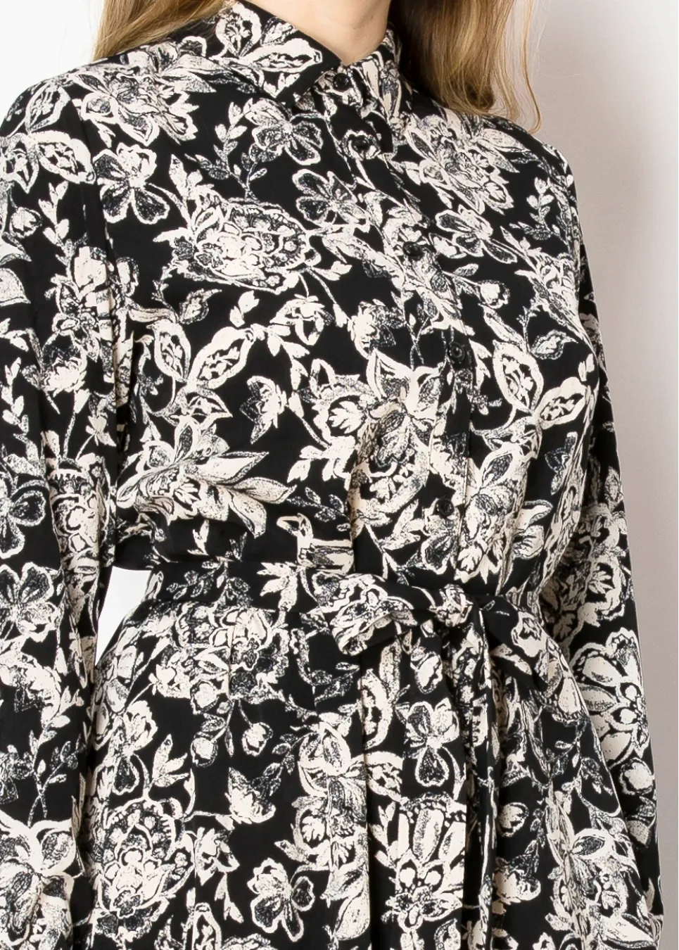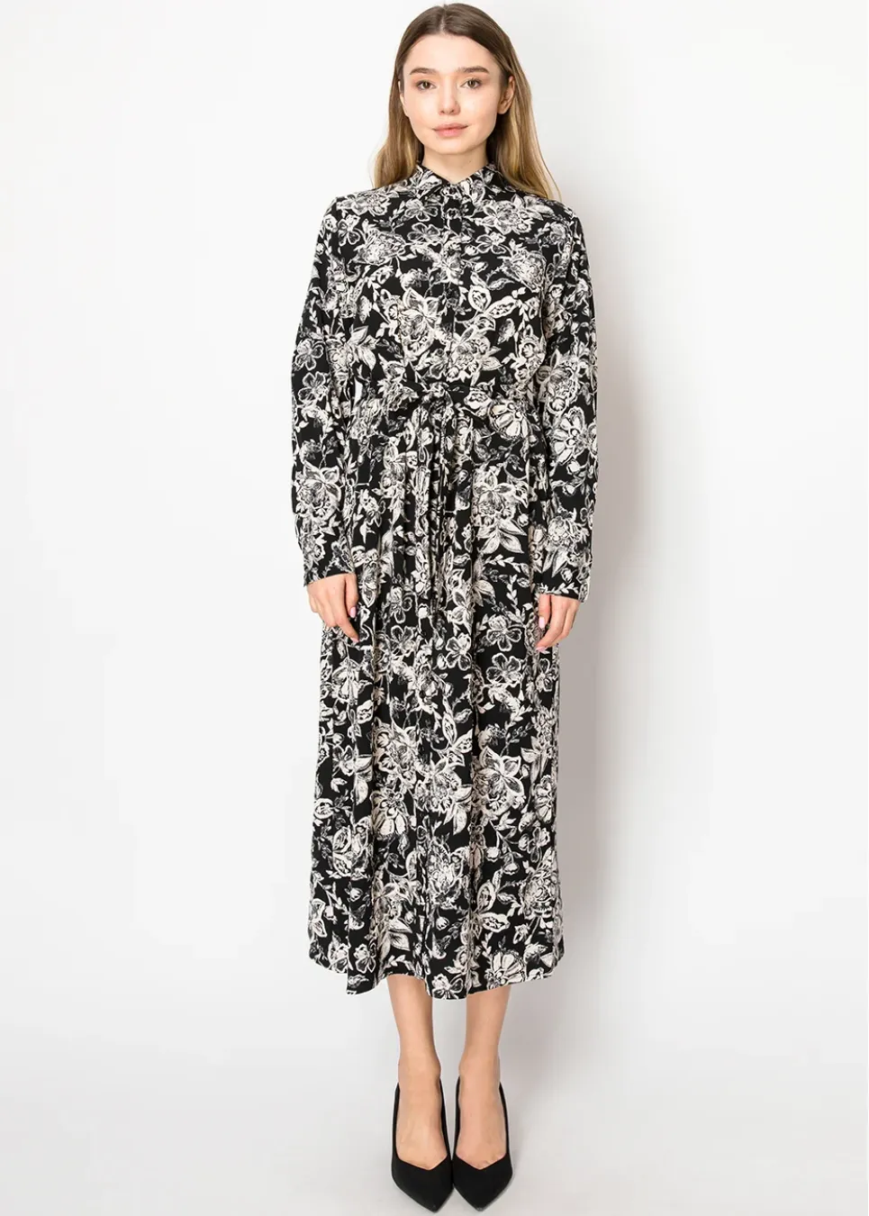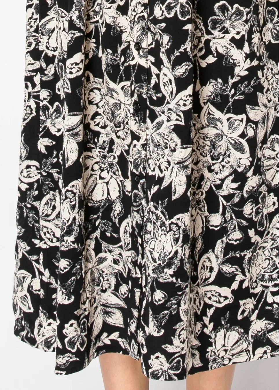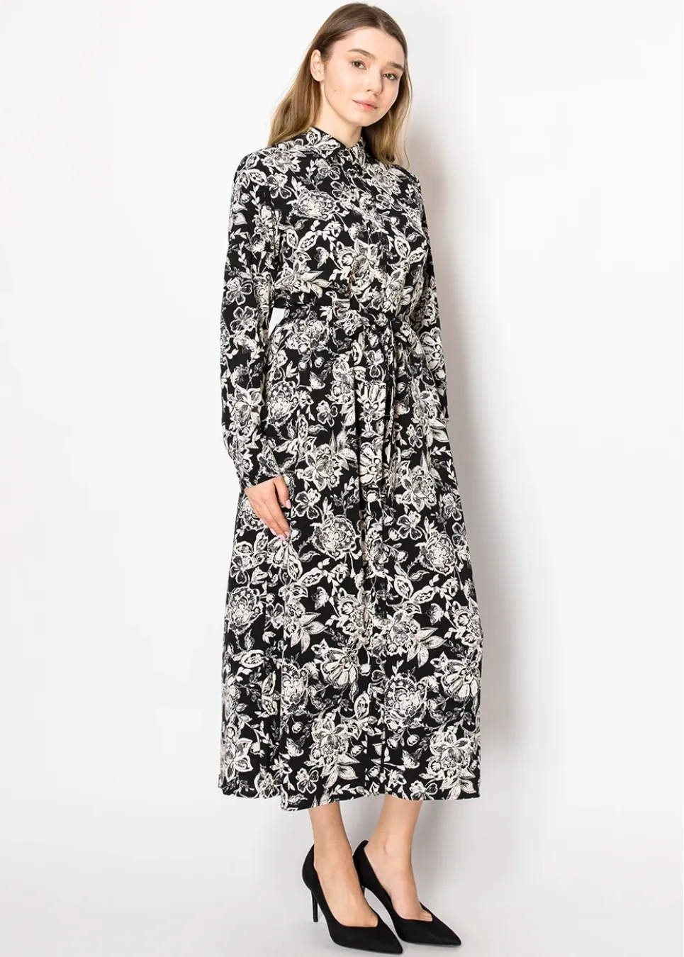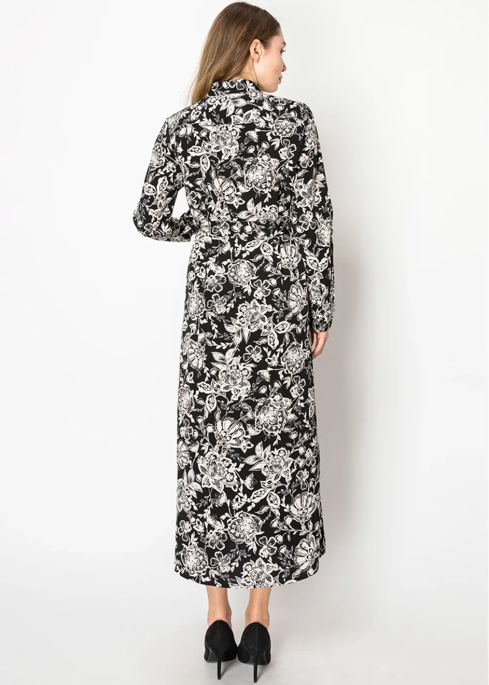 Channel timeless charm with this long, flowy dress. The classic black and white floral pattern is easy to pair with your favorite accessories, and the button-front detail adds a subtle vintage vibe. Perfect for staying stylish without compromising comfort.