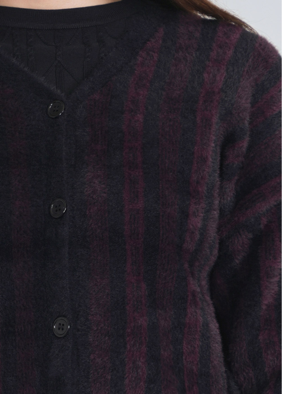 Warmth in Stripes: Burgundy & Black Cardigan in Furry Texture