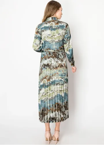 This dress has the perfect blend of structure and flow. The button-up top gives it a polished look, while the pleated skirt adds effortless movement. The watercolor-inspired print in earthy blues, greens, and browns feels soft and natural. Tie the waist belt for a defined fit, or wear it loose for a relaxed feel.