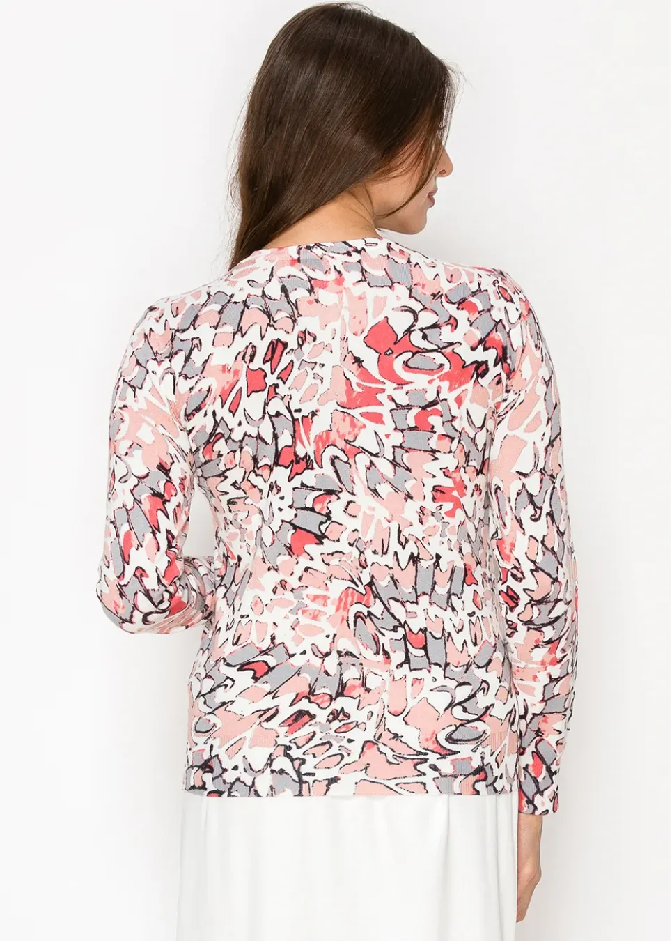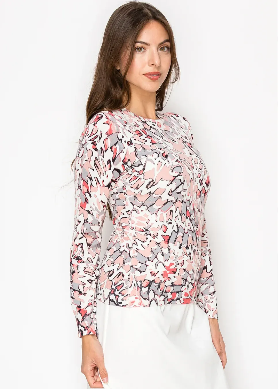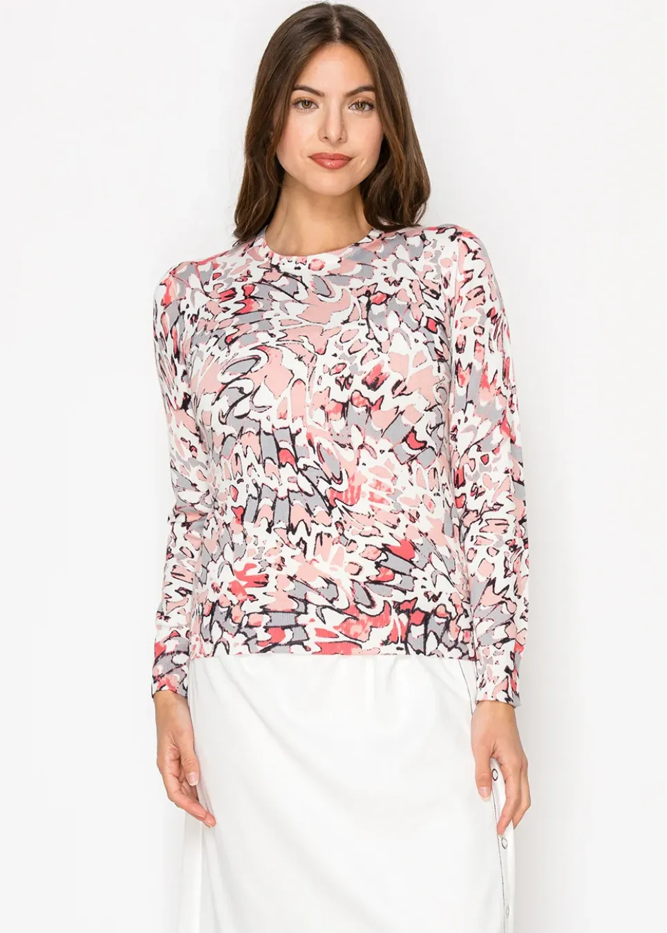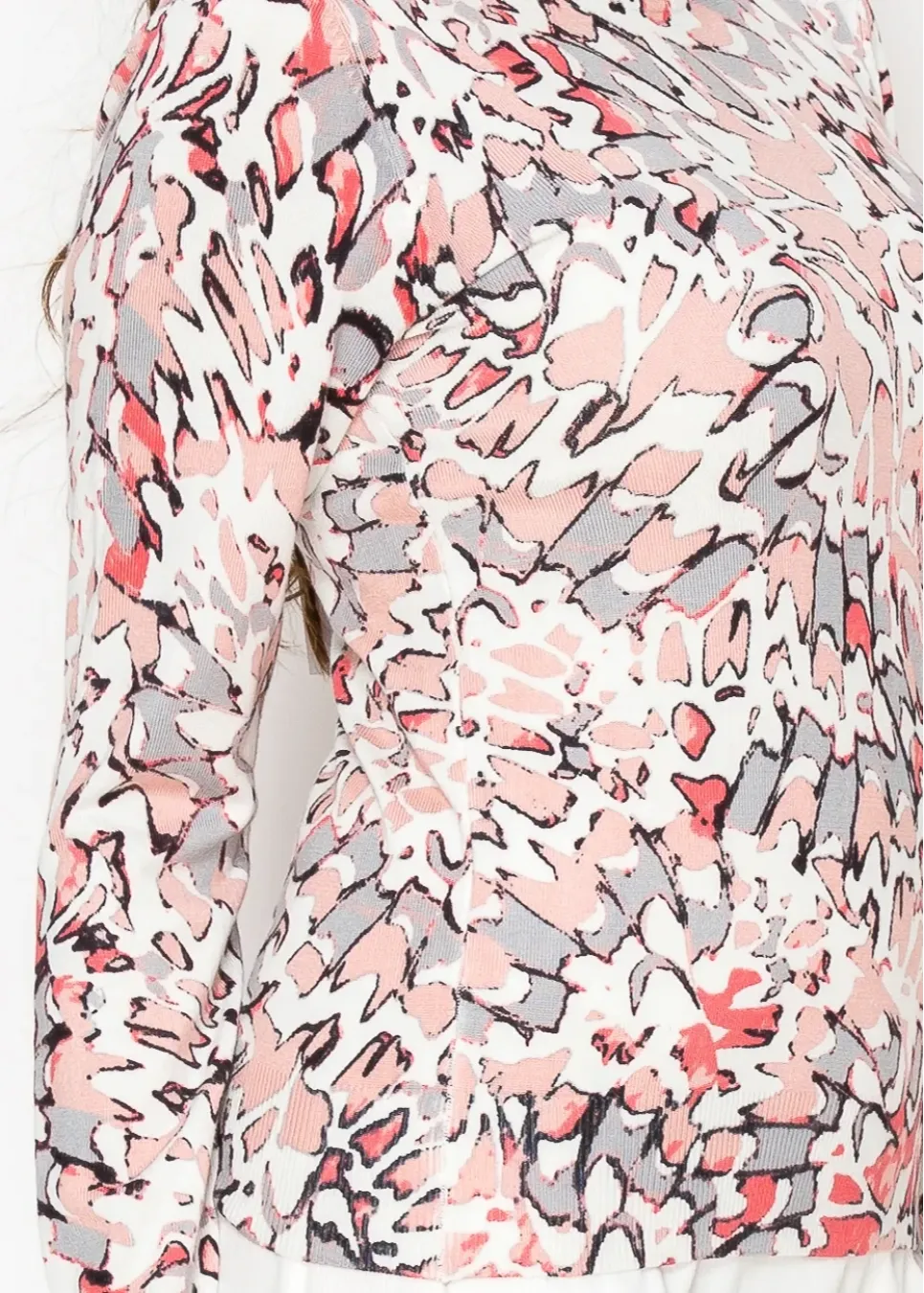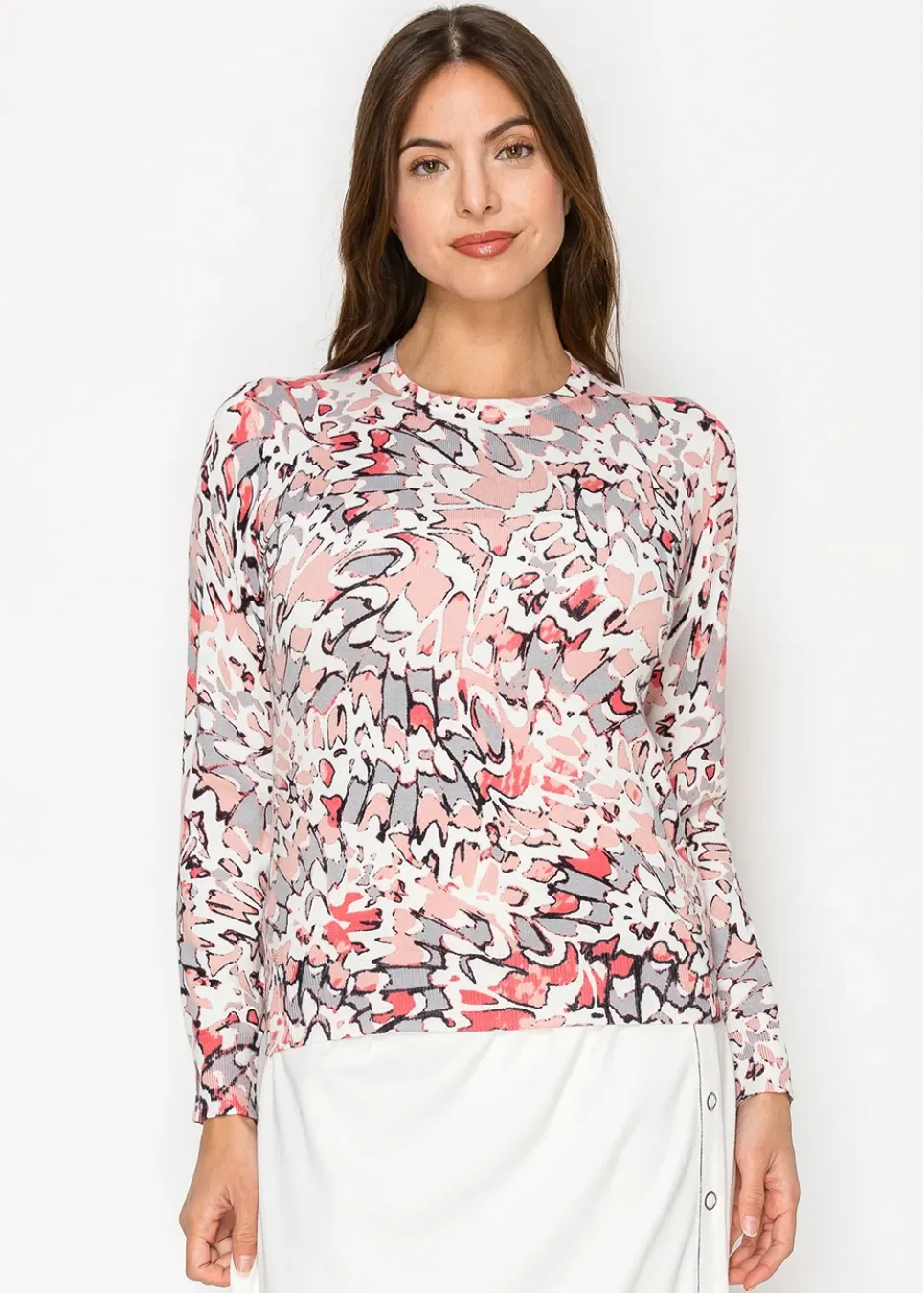 With its artistic splash of pinks, whites, and greys, this pullover feels like a wearable painting. The crew neck and long sleeves give it a classic feel, while the unique pattern adds personality. Pair it with a simple skirt for a polished yet comfortable outfit.