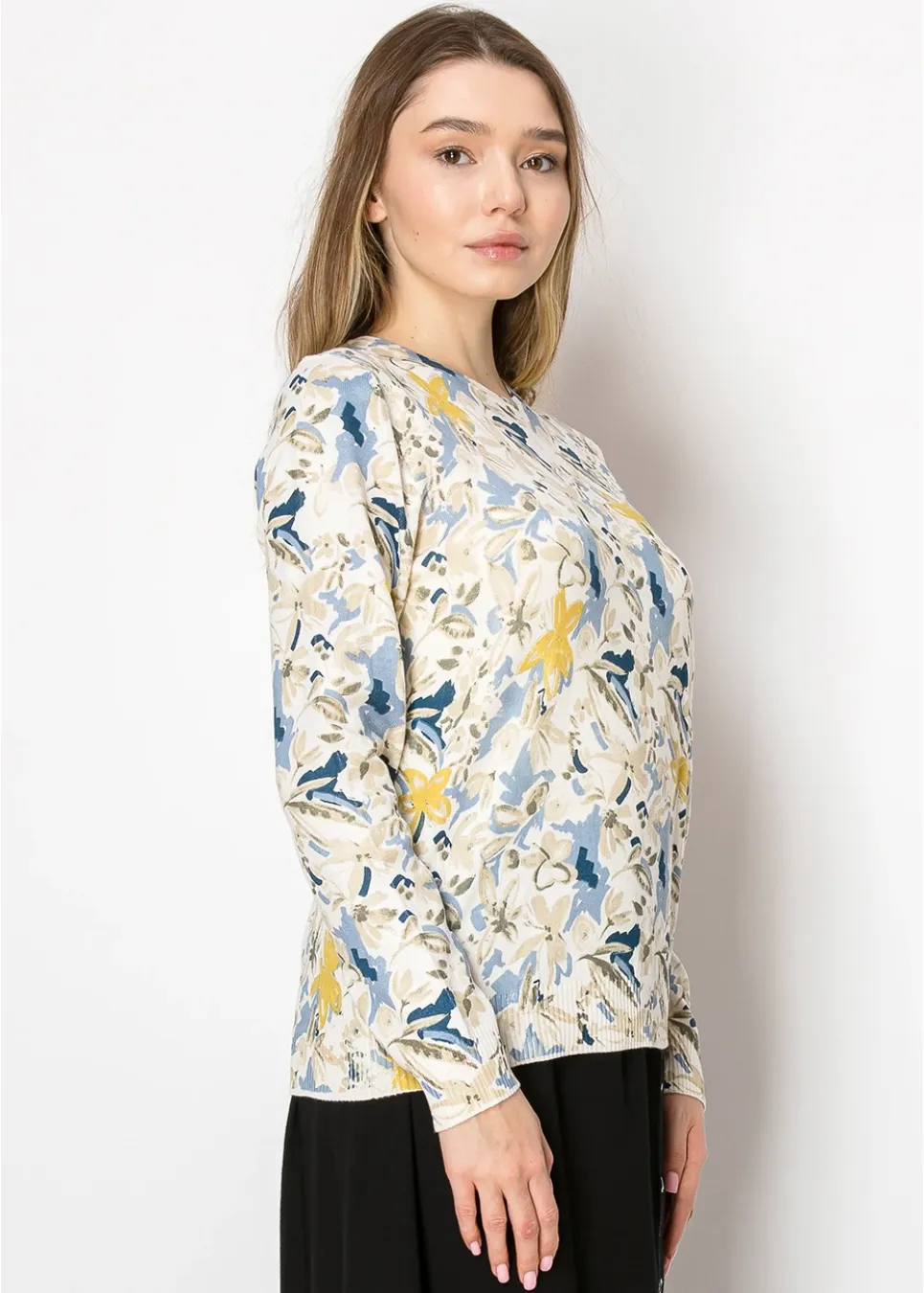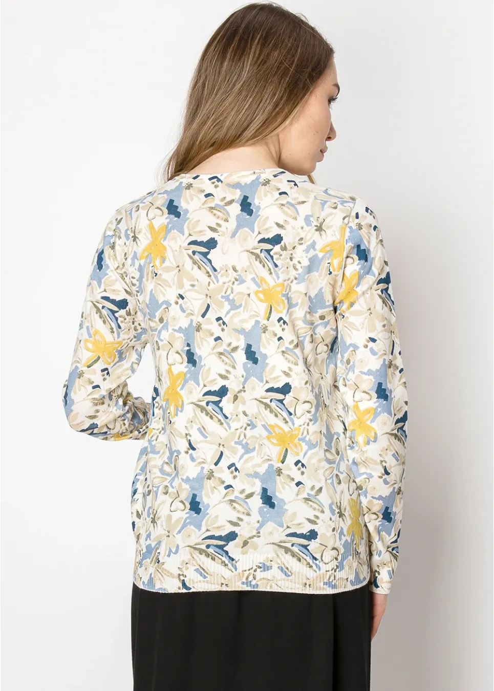 A sweater inspired by nature’s quiet beauty. With its soft beige base, playful golden blooms, and soothing blue accents, this piece feels like a morning stroll through a peaceful meadow. Ribbed cuffs and hem complete the cozy, polished look.