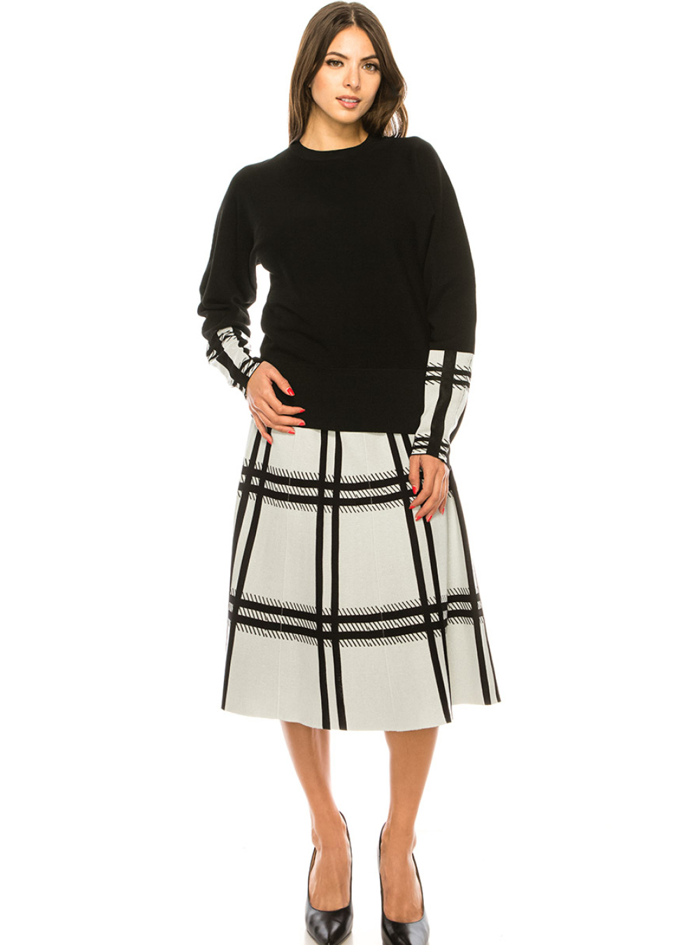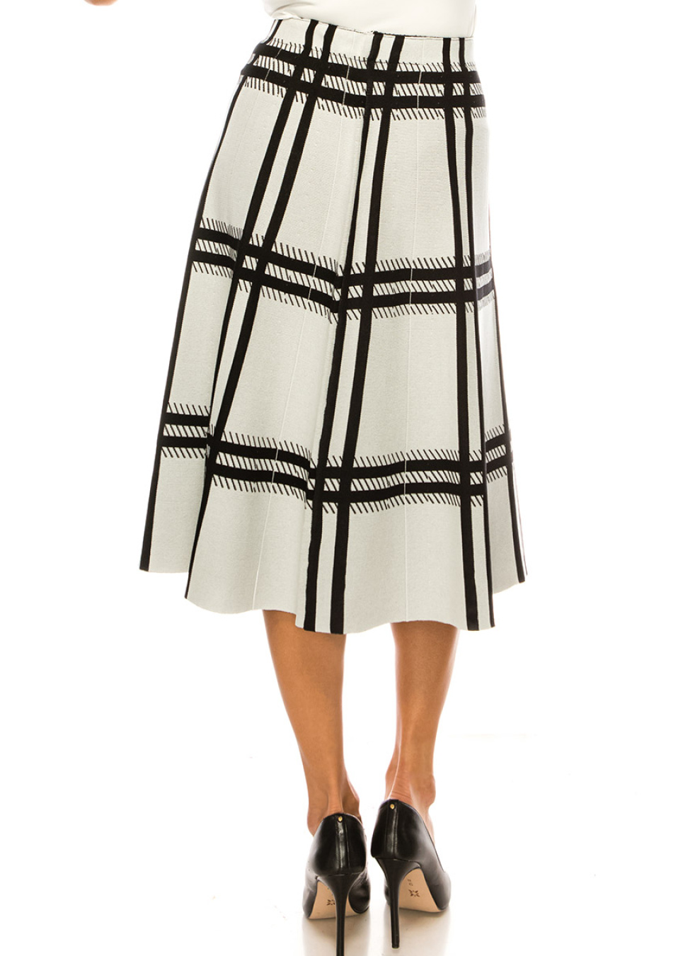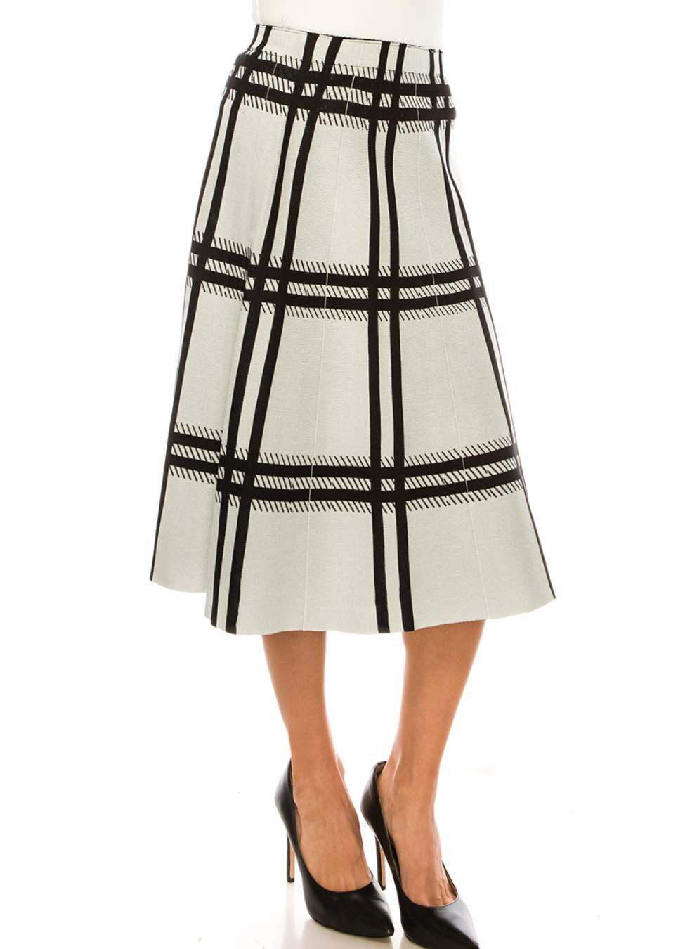 Bring some pattern into your wardrobe with this black and white plaid A-line midi skirt. The timeless checkered design is given a contemporary twist with a unique mix of stripes that create a striking effect. The A-line silhouette flatters every body type, while the midi length provides the perfect balance of modesty and style.
