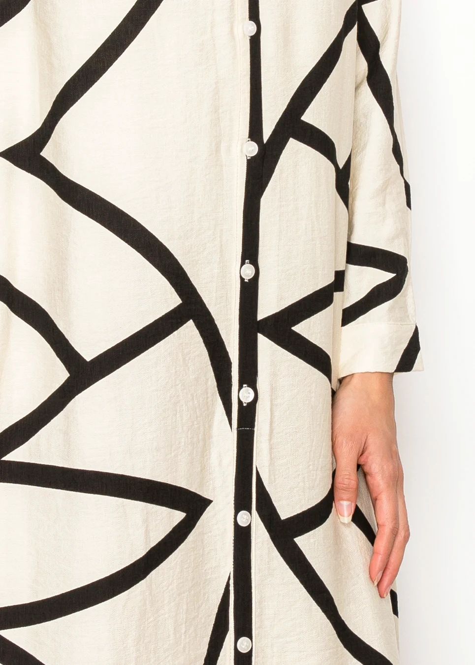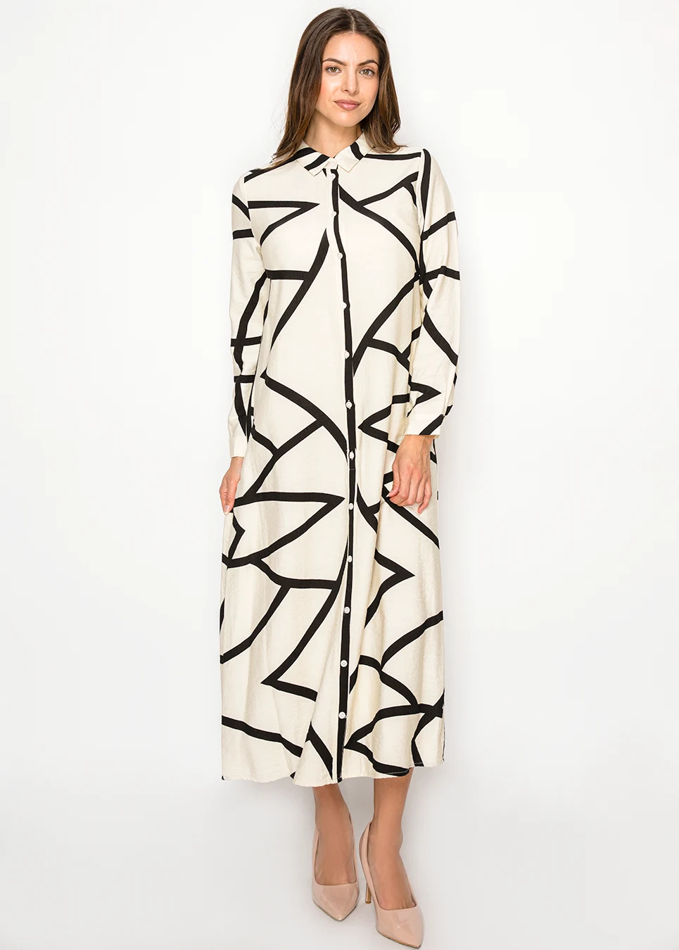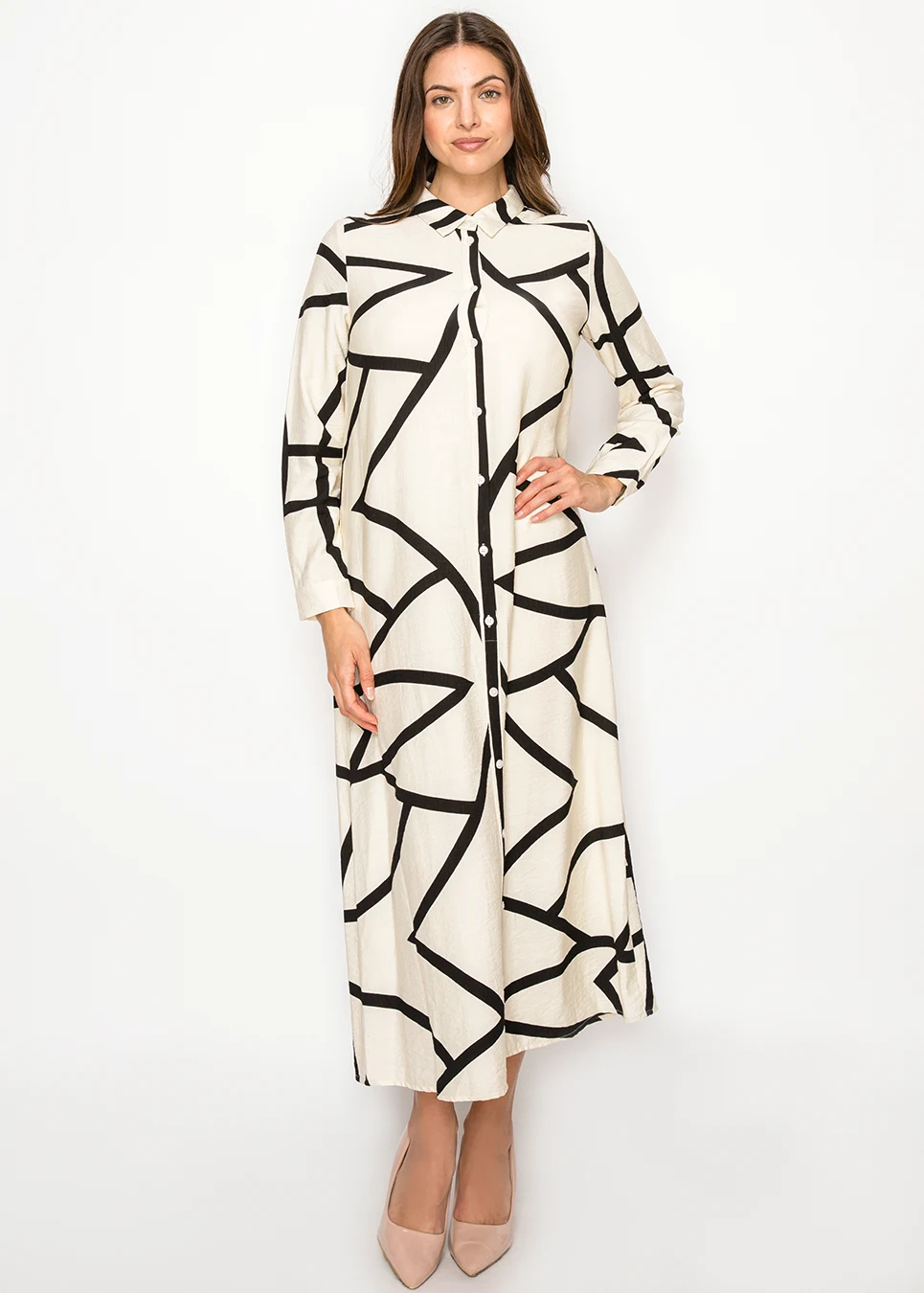 A crisp ivory maxi dress elevated with bold abstract black lines and a clean button-front silhouette. It’s polished enough for events, yet effortless enough to wear on an ordinary weekday when you want to feel put together.