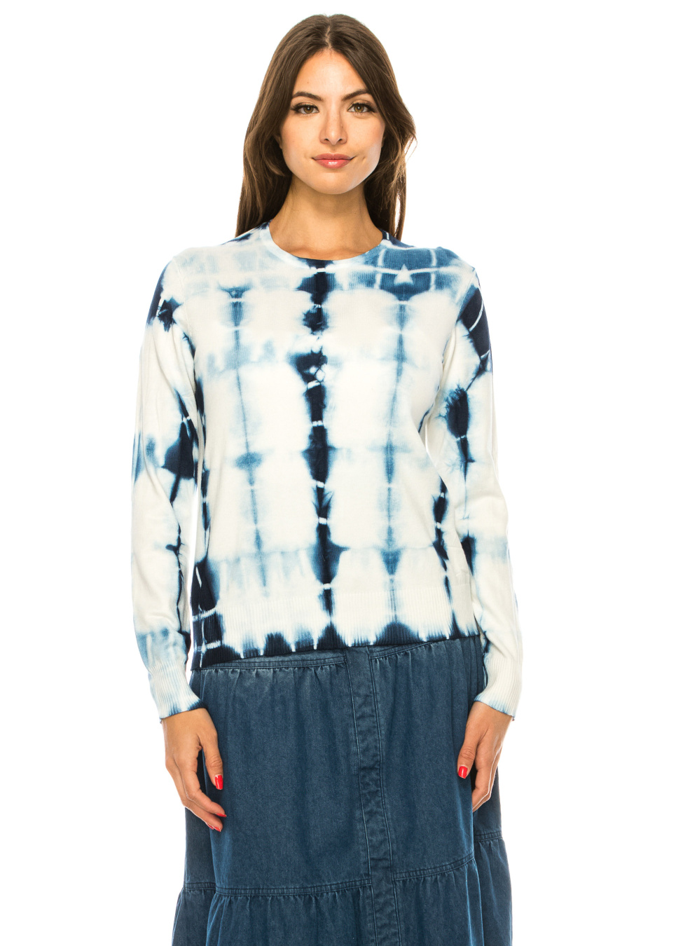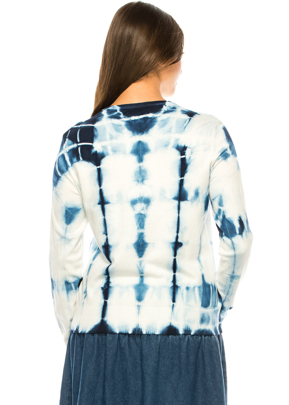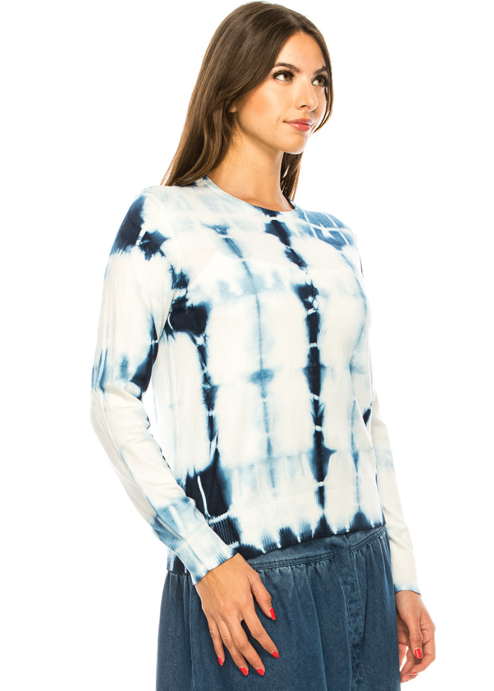 Get ready for the tie-dye trend with this white and blue sweater. The unique and playful tie-dye pattern makes a statement, while the ribbed hem and cuffs add a touch of sophistication. The soft fabric will keep you cozy all day long.
