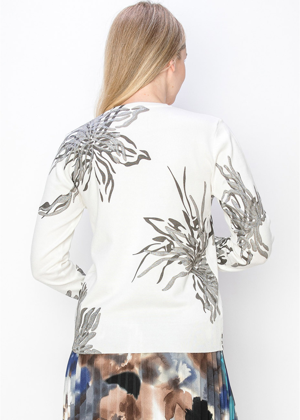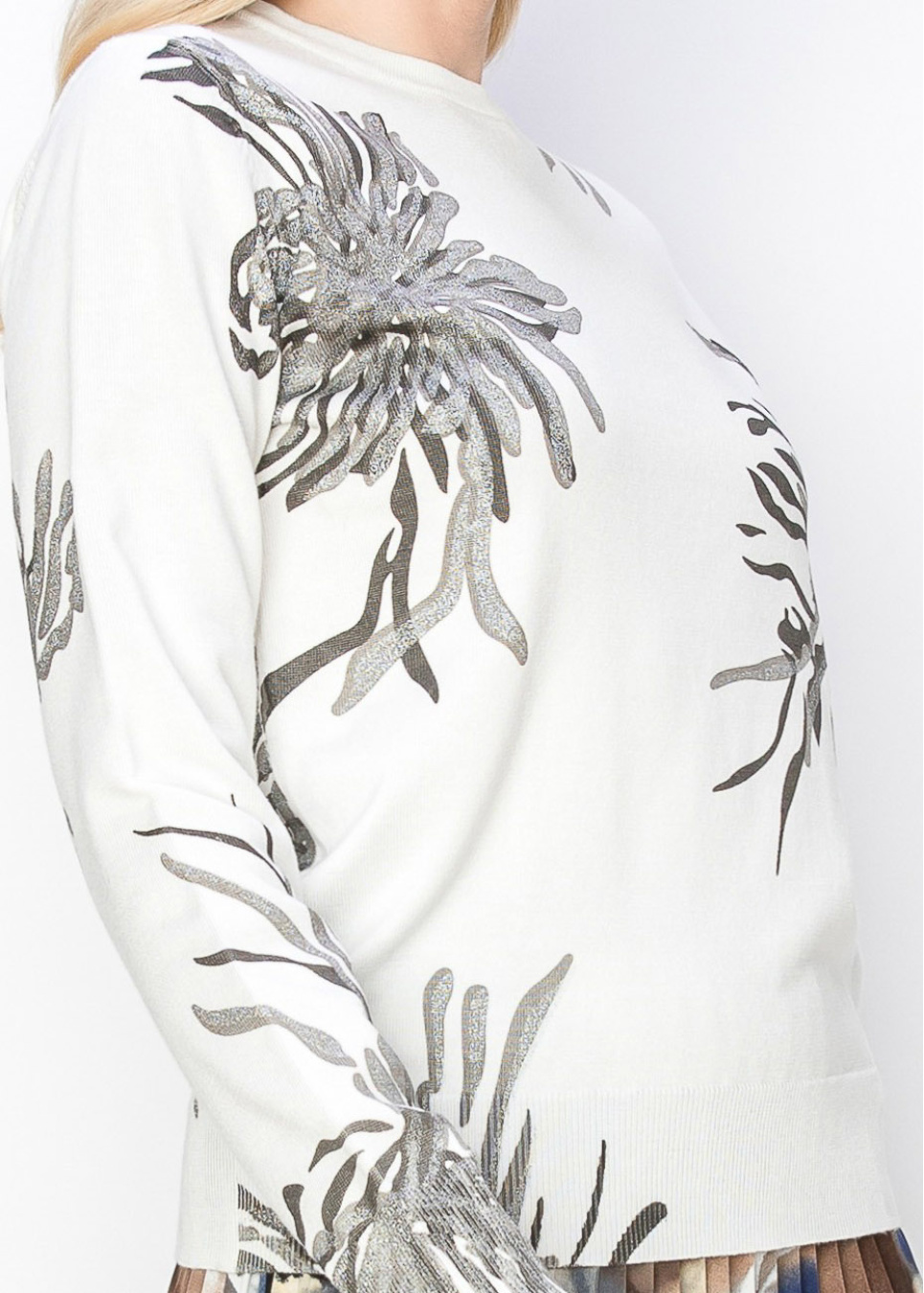 A white sweater with eye-catching silver floral designs, this piece effortlessly blends modern and classic. The long sleeves and modest fit make it a versatile option for any wardrobe. Dress it up or down, this sweater adds an artistic vibe to your everyday look.