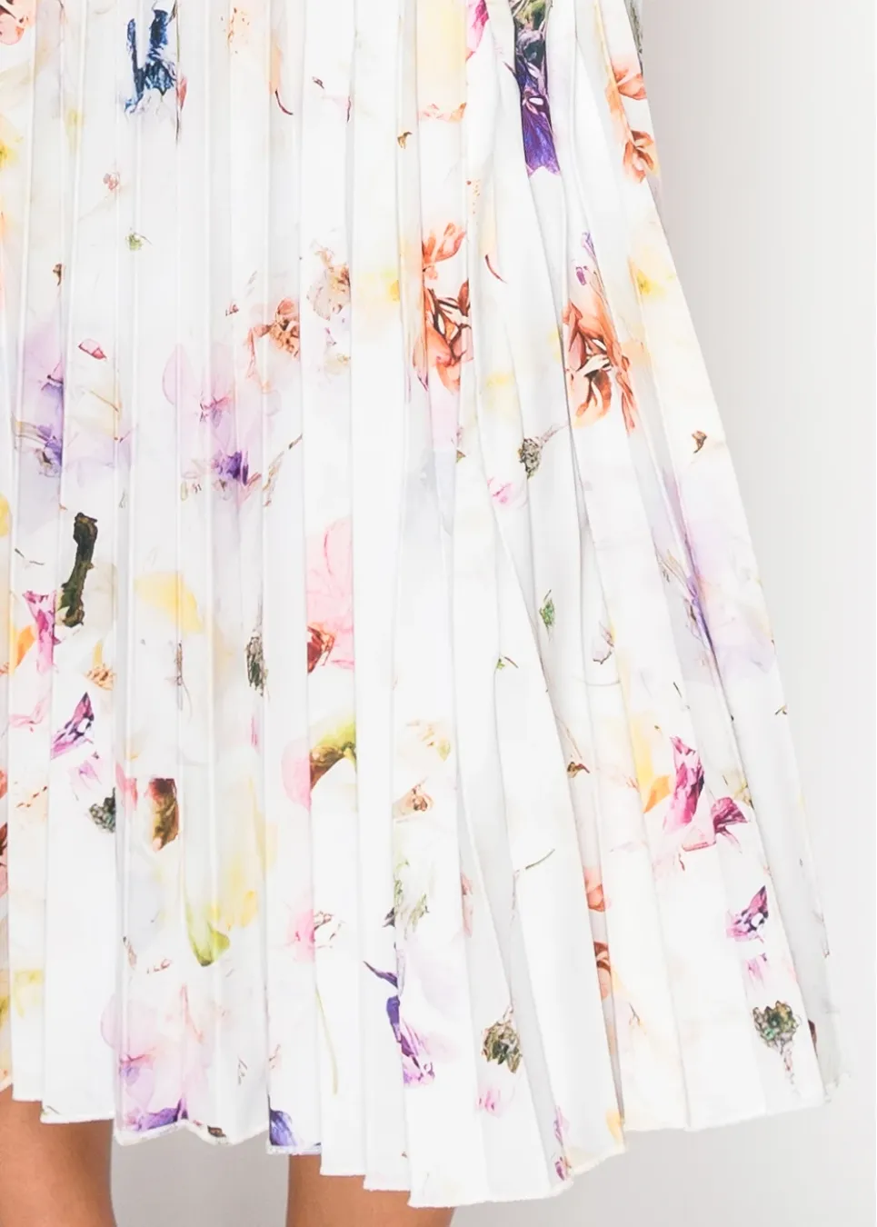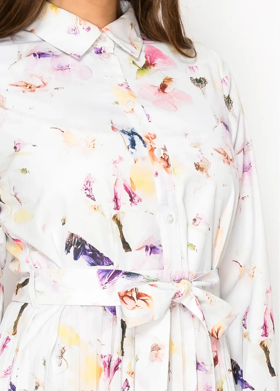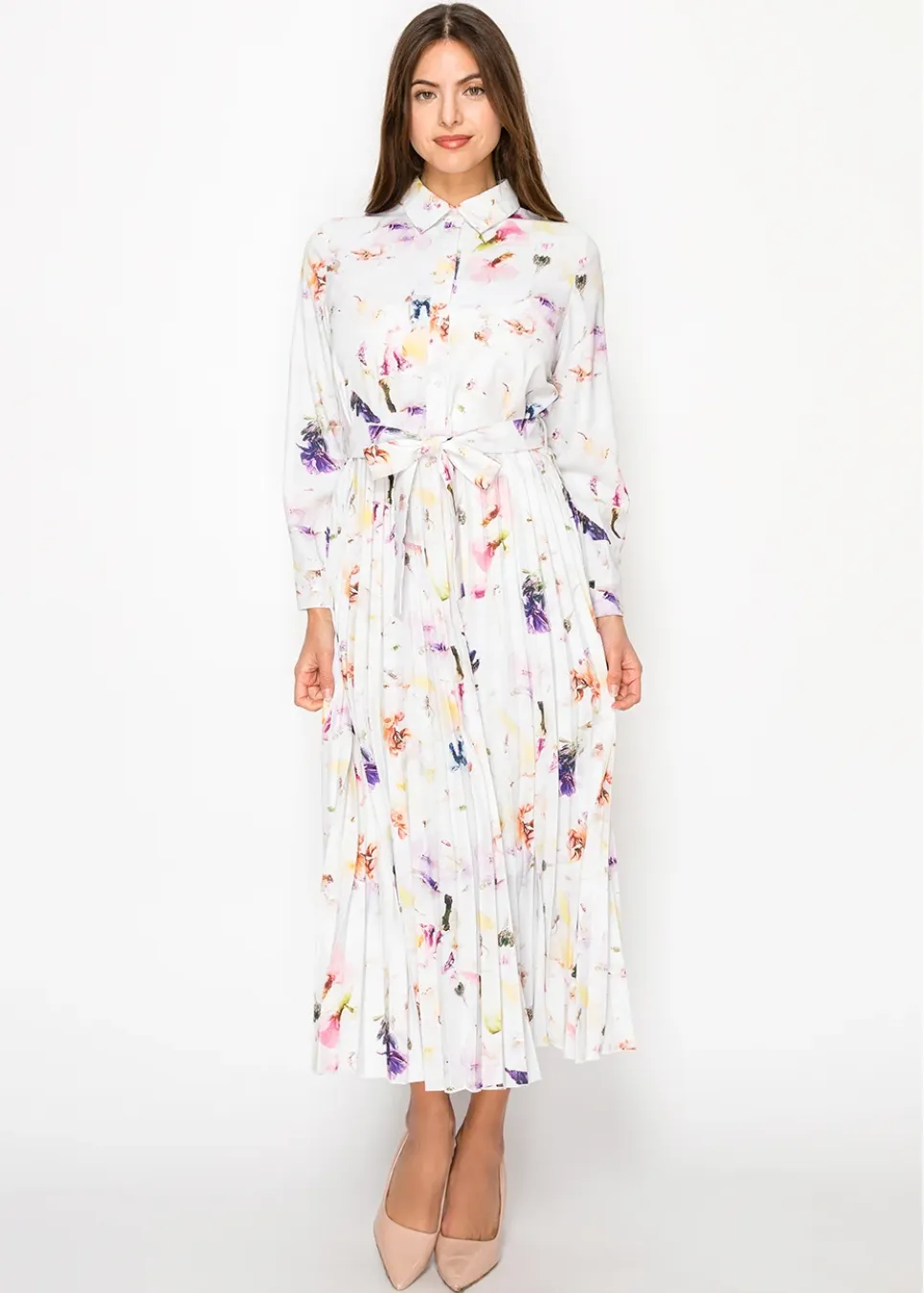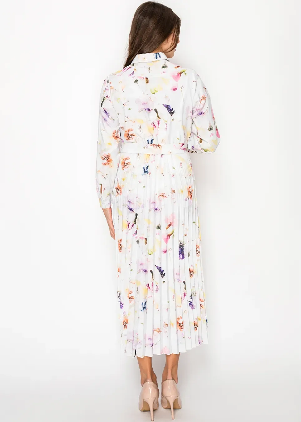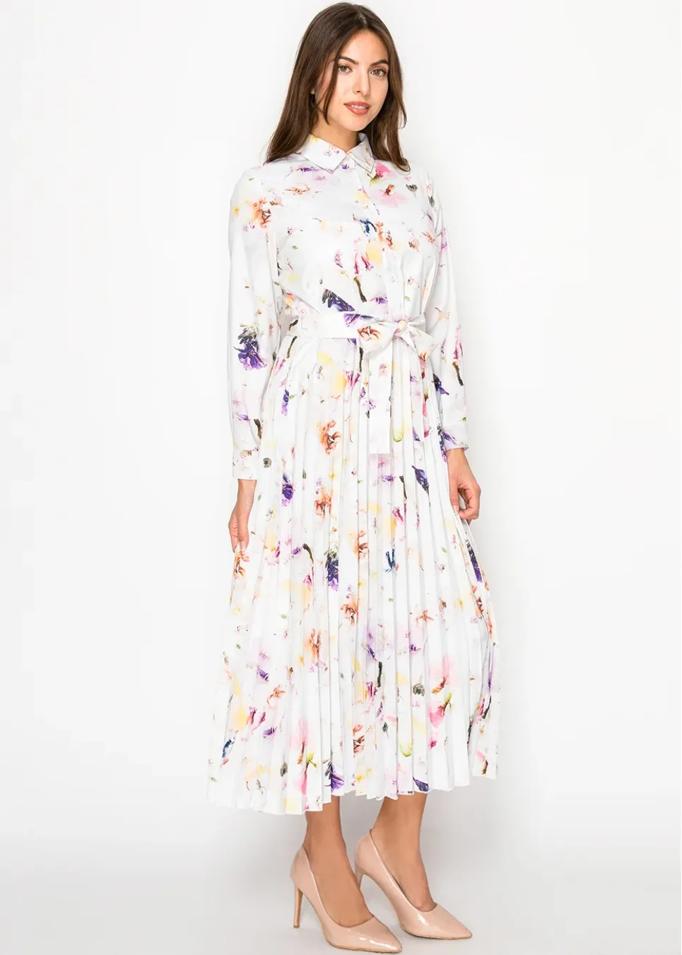 White Blossom Pleated Dress with Belt