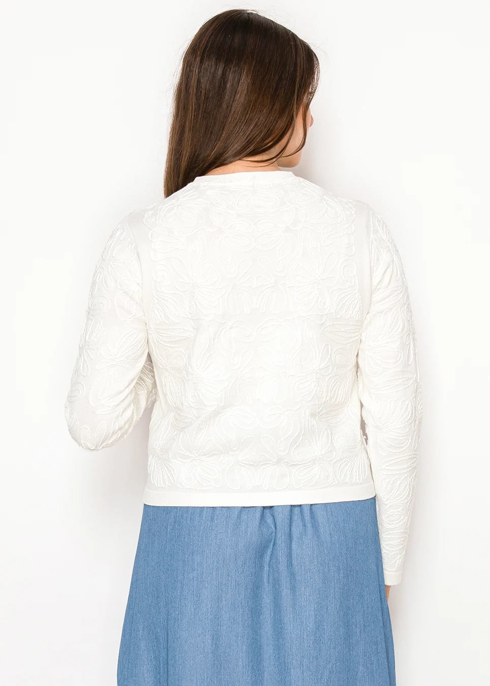 Cropped, buttoned, fully embroidered — this cardigan earns every compliment it gets. The floral pattern is raised and dimensional, catching light as you move. Clean ivory, long sleeves, ribbed edges. One of those pieces that photographs beautifully and looks even better in person.