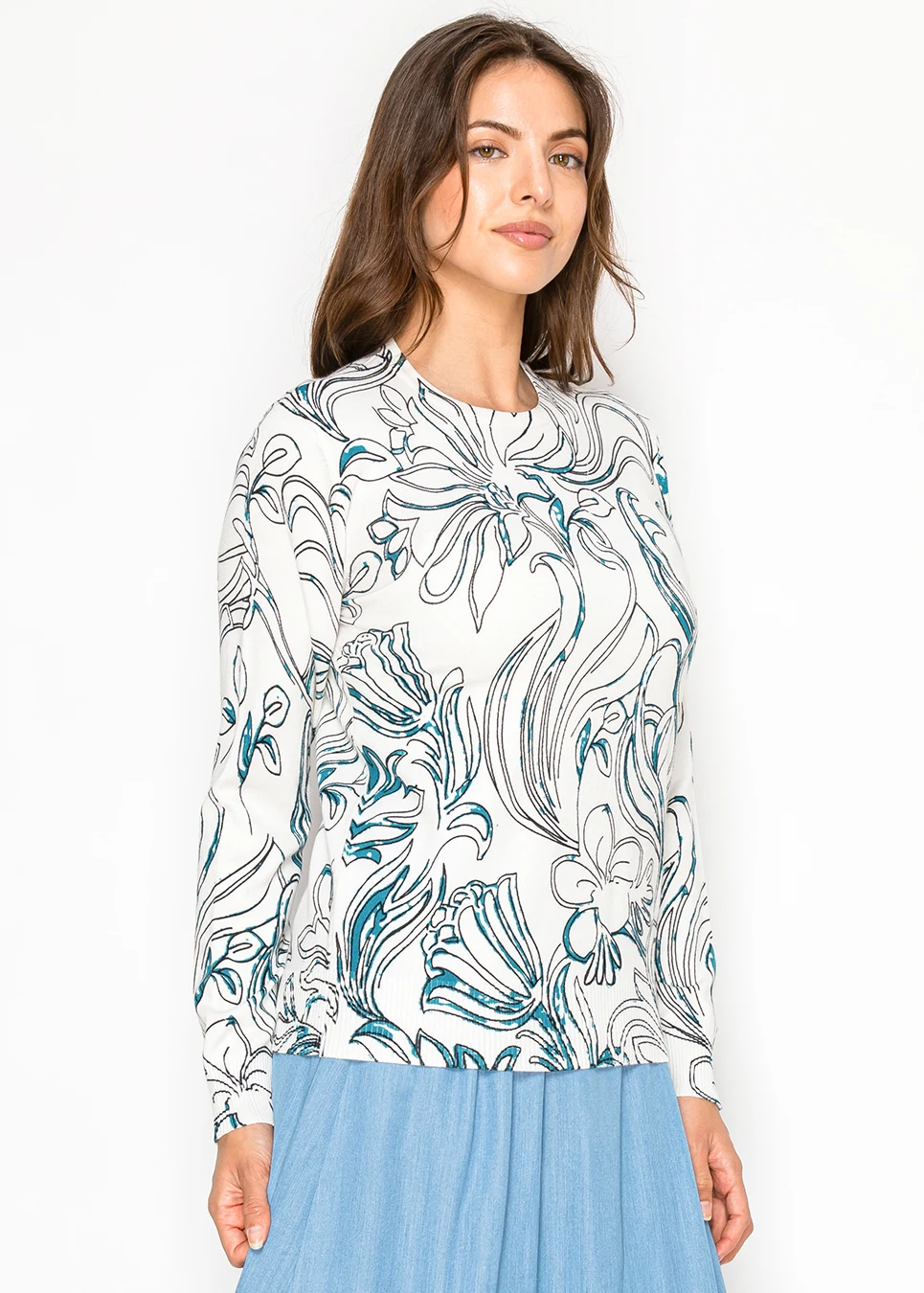 White Crew Neck Sweater — Painterly Floral Print