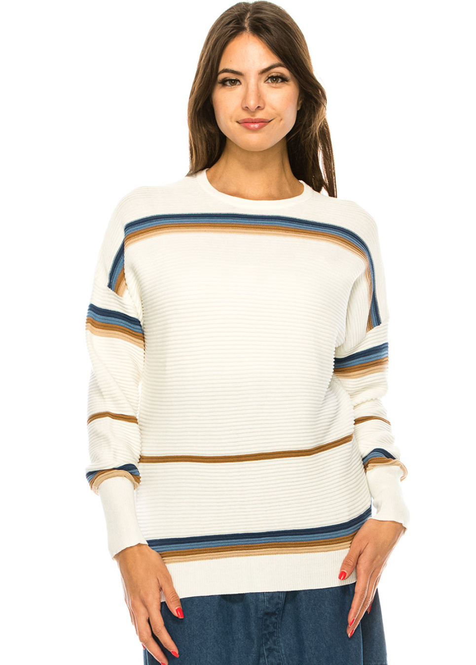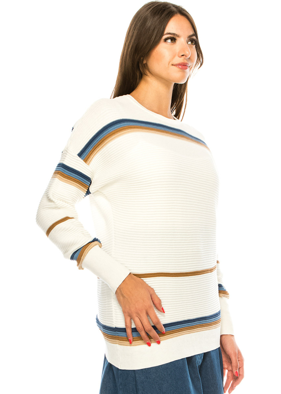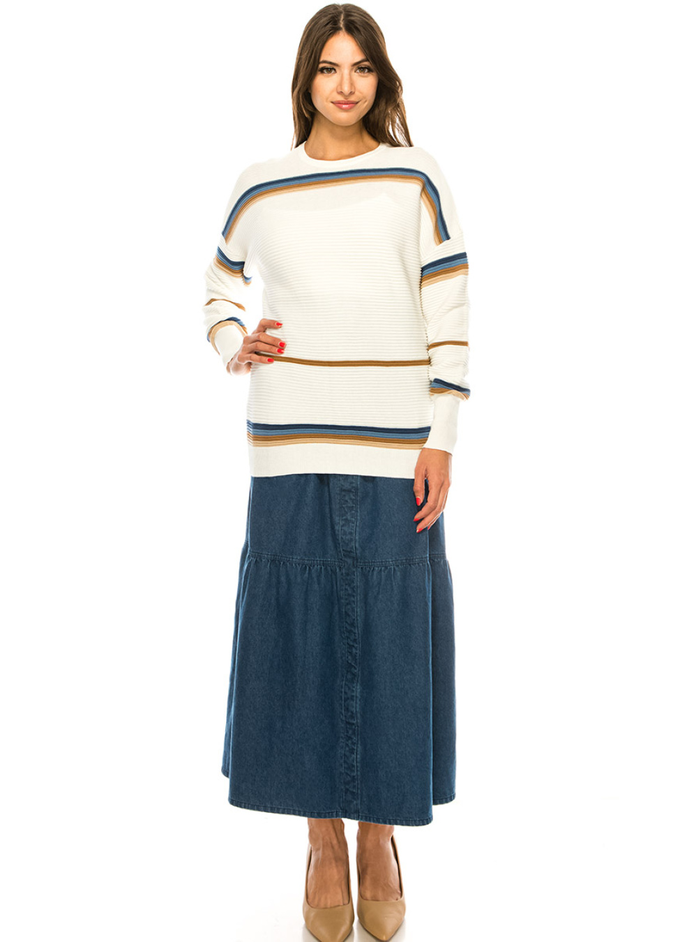 This white ribbed sweater is the perfect combination of comfort and style. The playful horizontal stripes add a touch of whimsy to the relaxed fit, which features a dropped shoulder line for an effortless look. The soft, high-quality fabric is ideal for layering, making it a versatile addition to your wardrobe. Whether you're running errands or going out for the evening, this sweater is the perfect choice for any frum woman who wants to feel comfortable and confident in her style.
