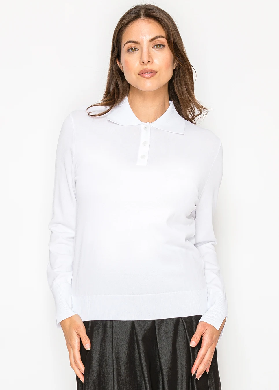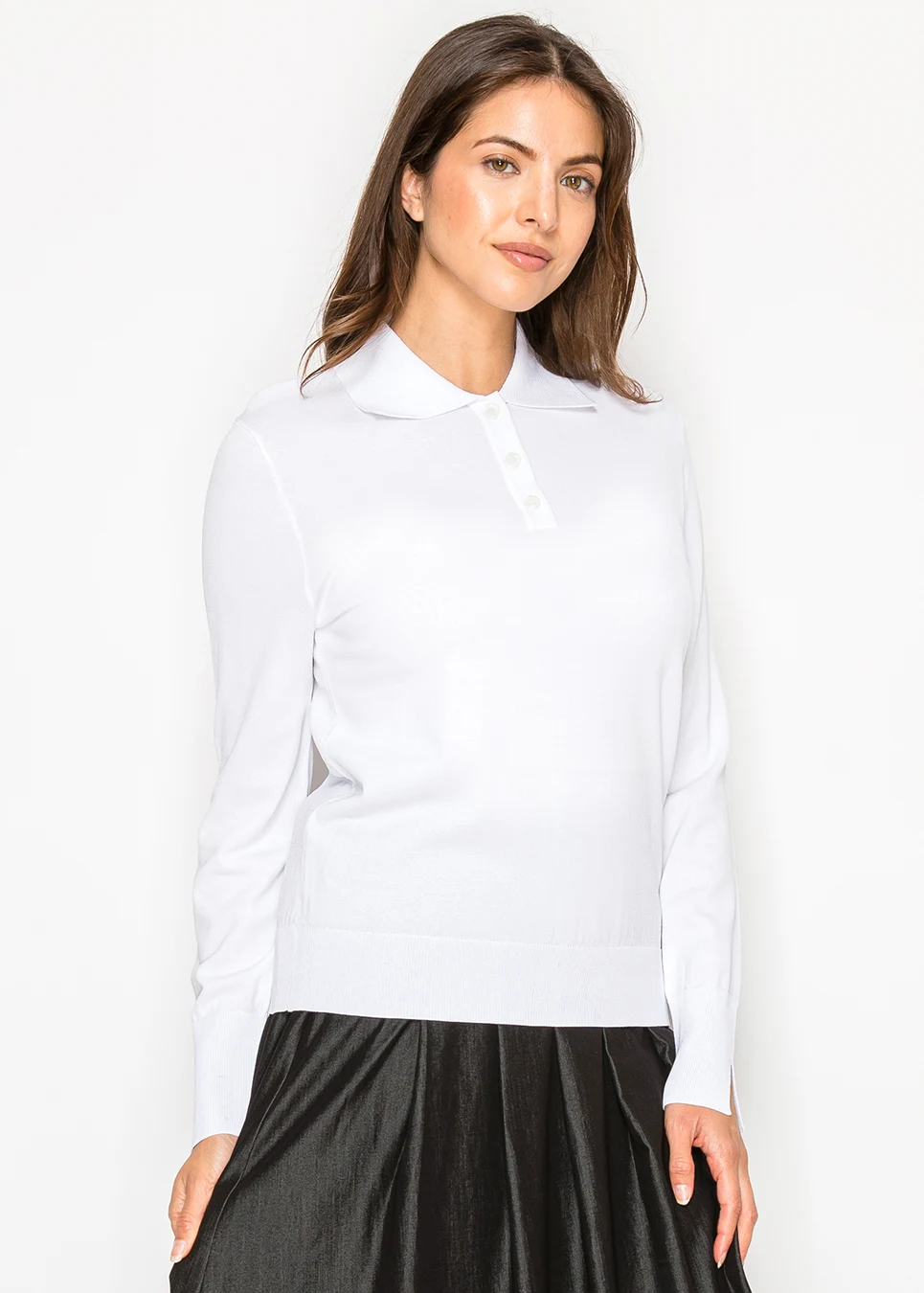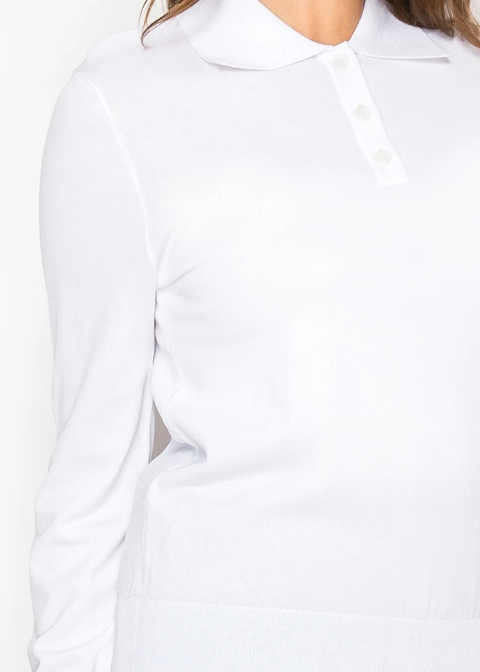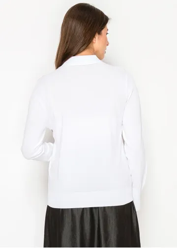 A clean white knit sweater finished with a neat polo collar and button placket. Lightweight yet structured, it’s an easy staple for layering or wearing on its own.