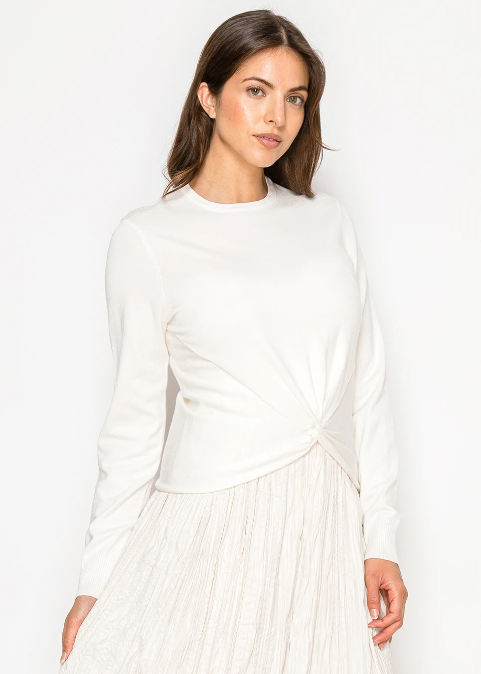 Clean white, smooth texture, and a soft fold at the front. A sweater that feels quiet, balanced, and thoughtfully composed.