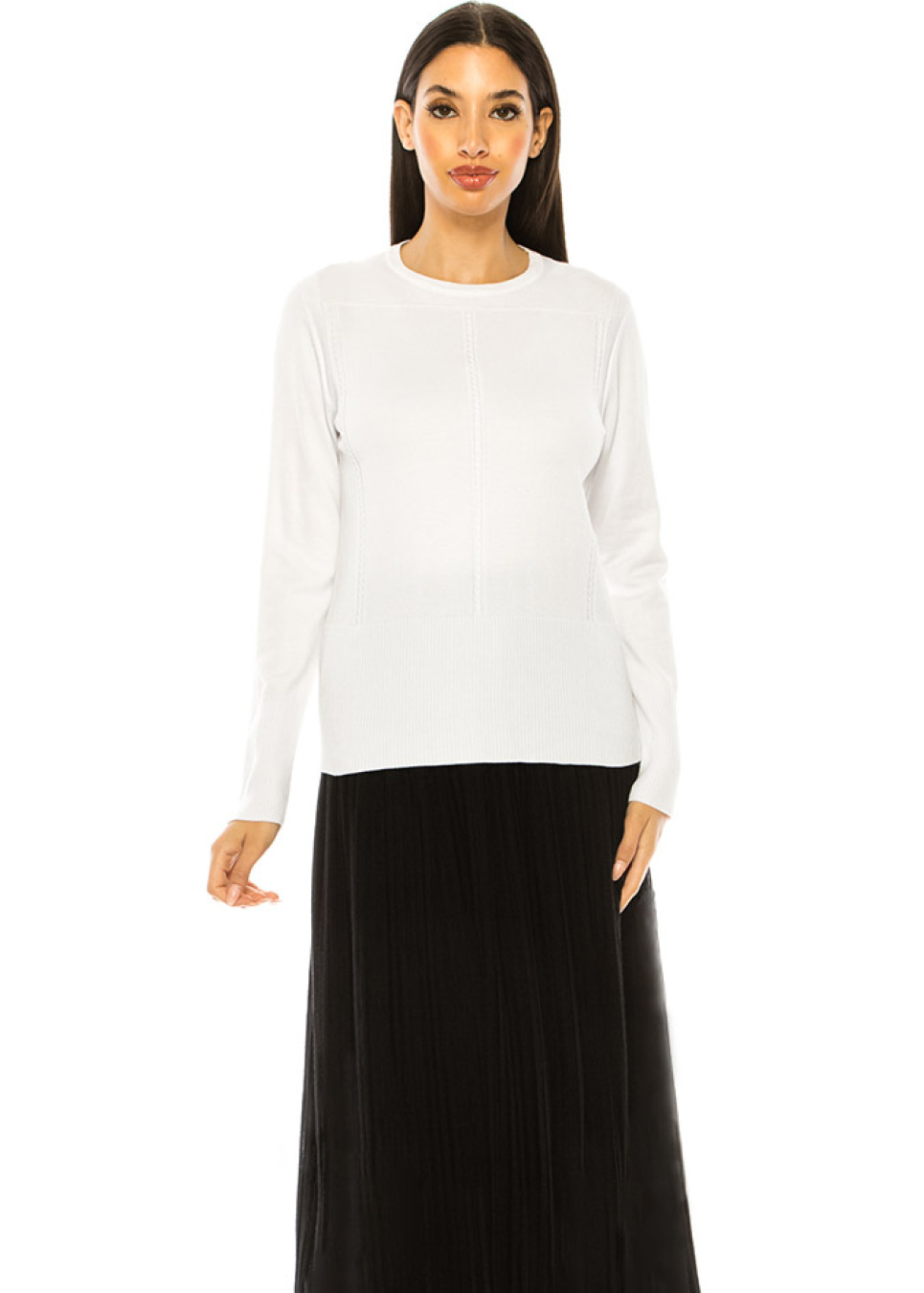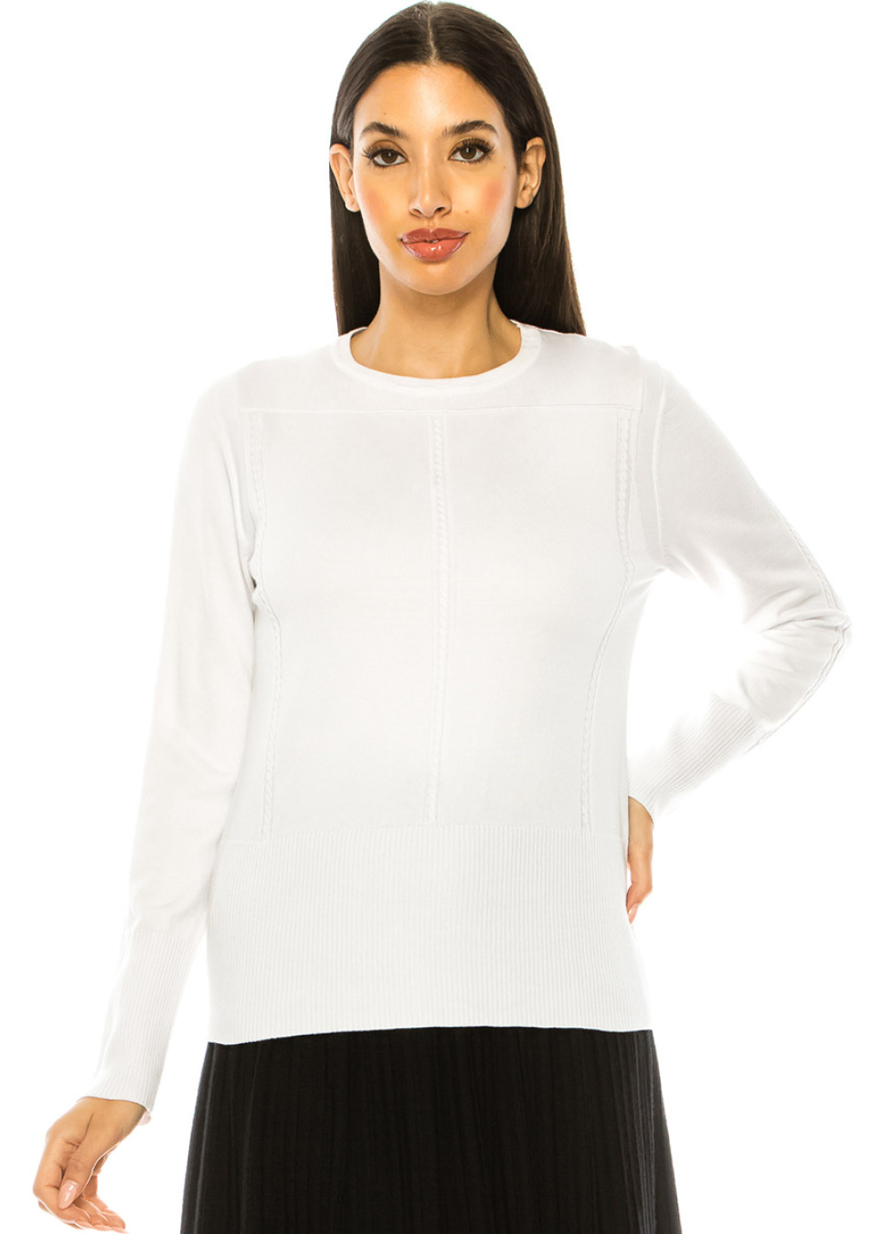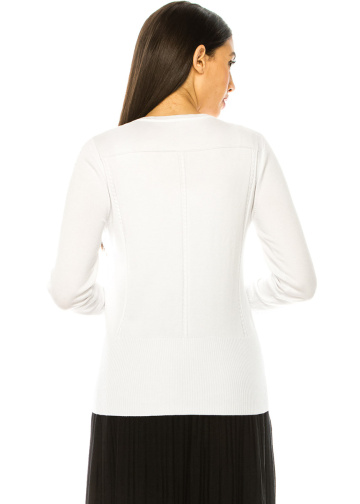 Introducing this stylish white knit sweater with decorative stripes that add a touch of sophistication to any outfit. Its comfortable pullover design and ribbed hem make it perfect for any occasion. Dress it up with a denim skirt and mules for a chic look or wear it with jeans for a casual feel. This versatile and trendy sweater is a must-have addition to your wardrobe.