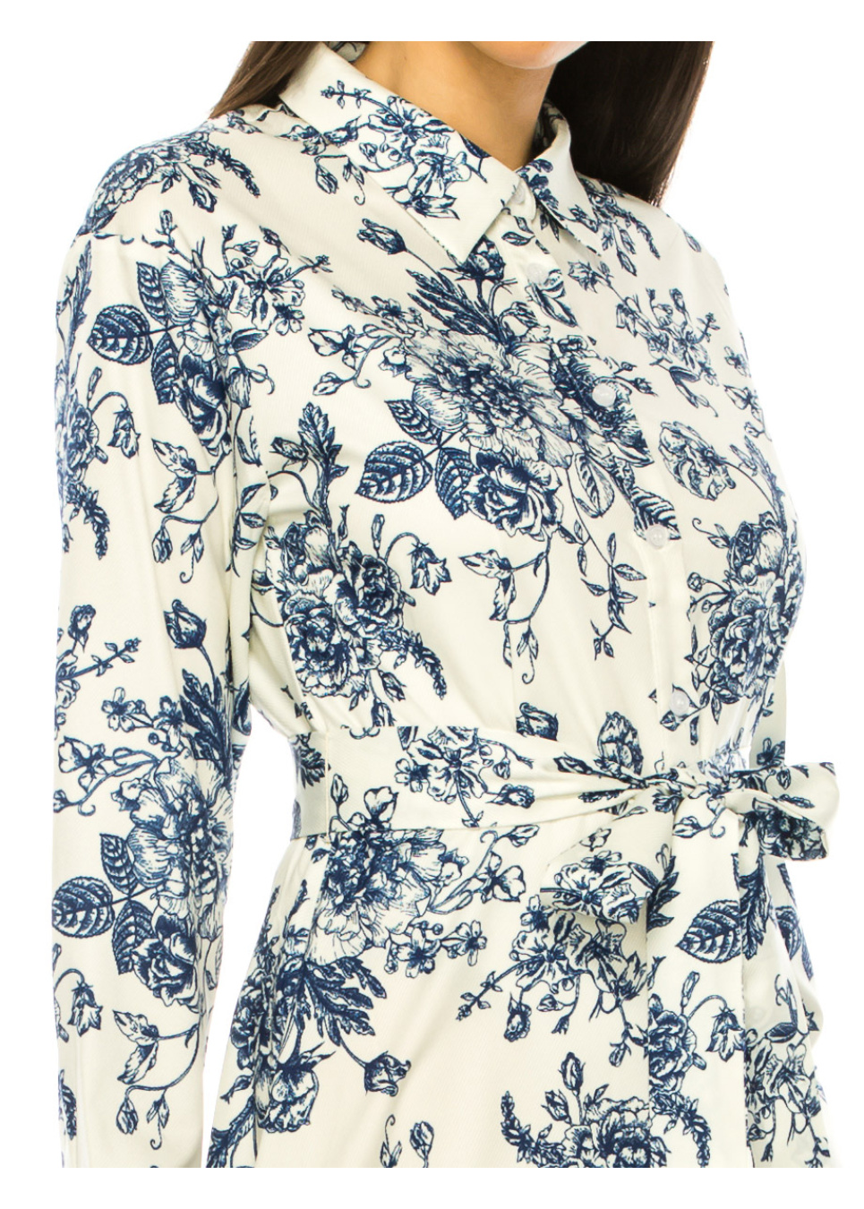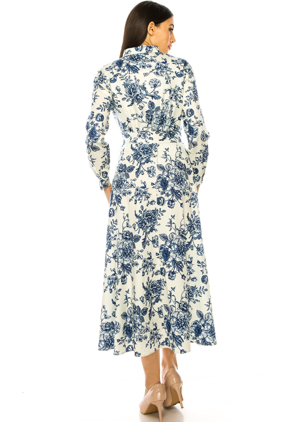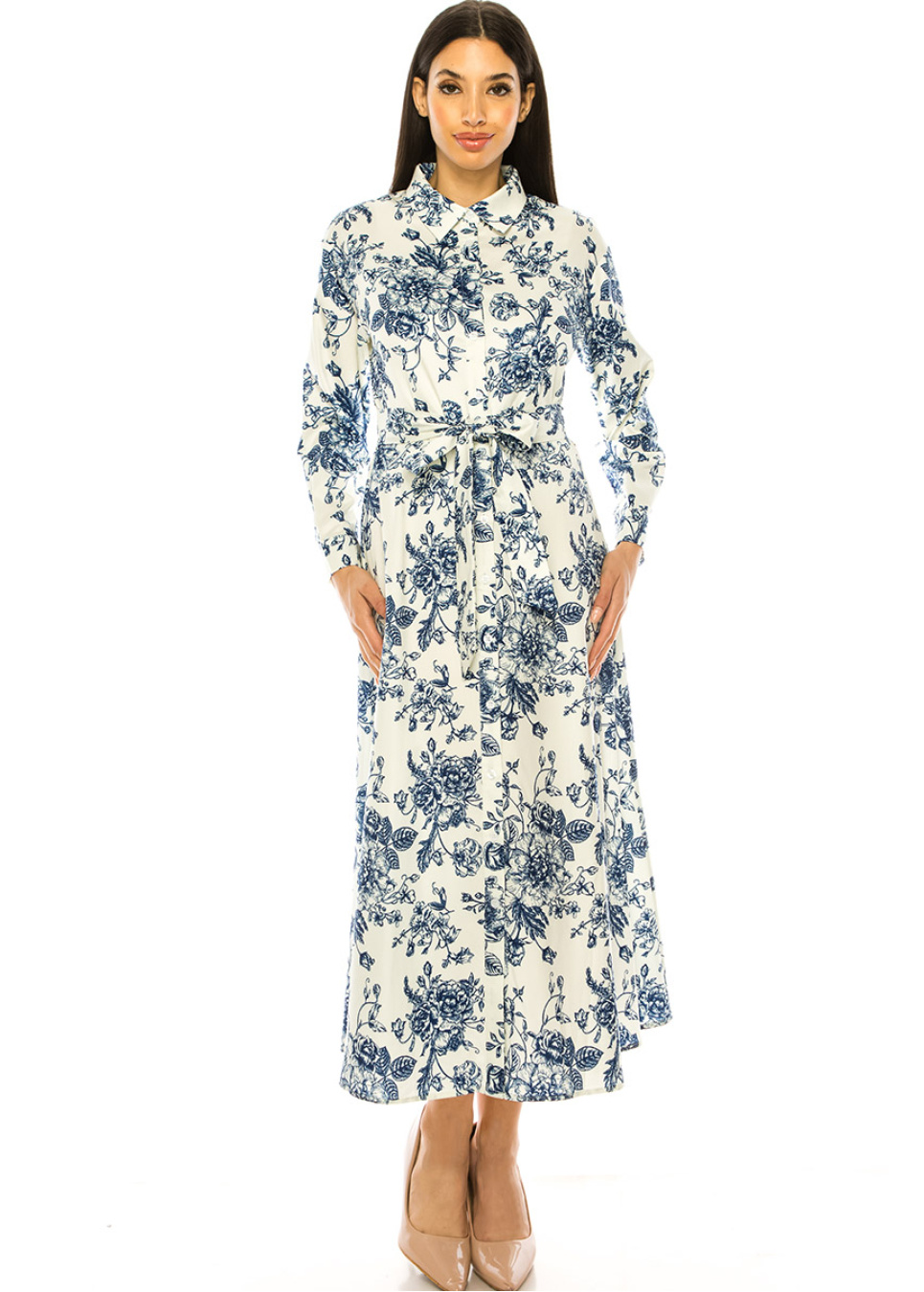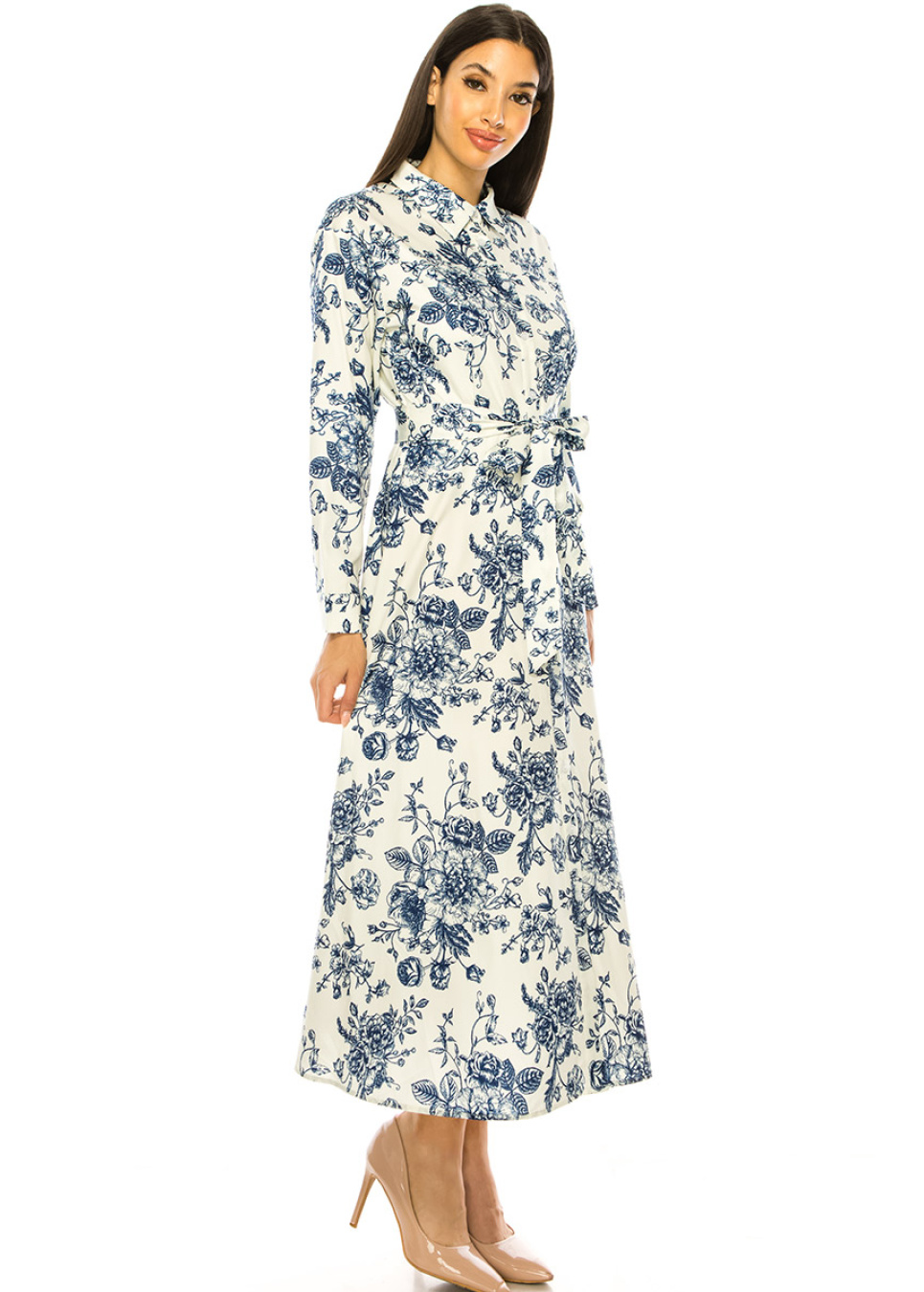 Step up your style game with this beautiful white maxi dress. The blue floral print adds a touch of femininity, while the shirt collar and long sleeves create a classic look. The waist belt cinches in your waist for a flattering silhouette, making this dress perfect for any occasion. Dress it up with heels or keep it casual with sneakers - either way, you're sure to turn heads.