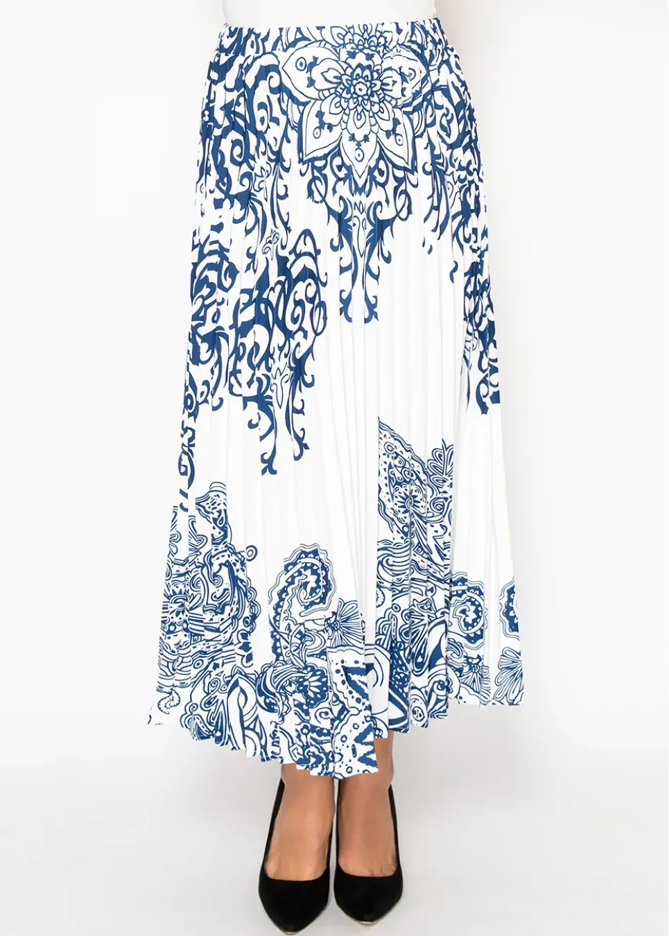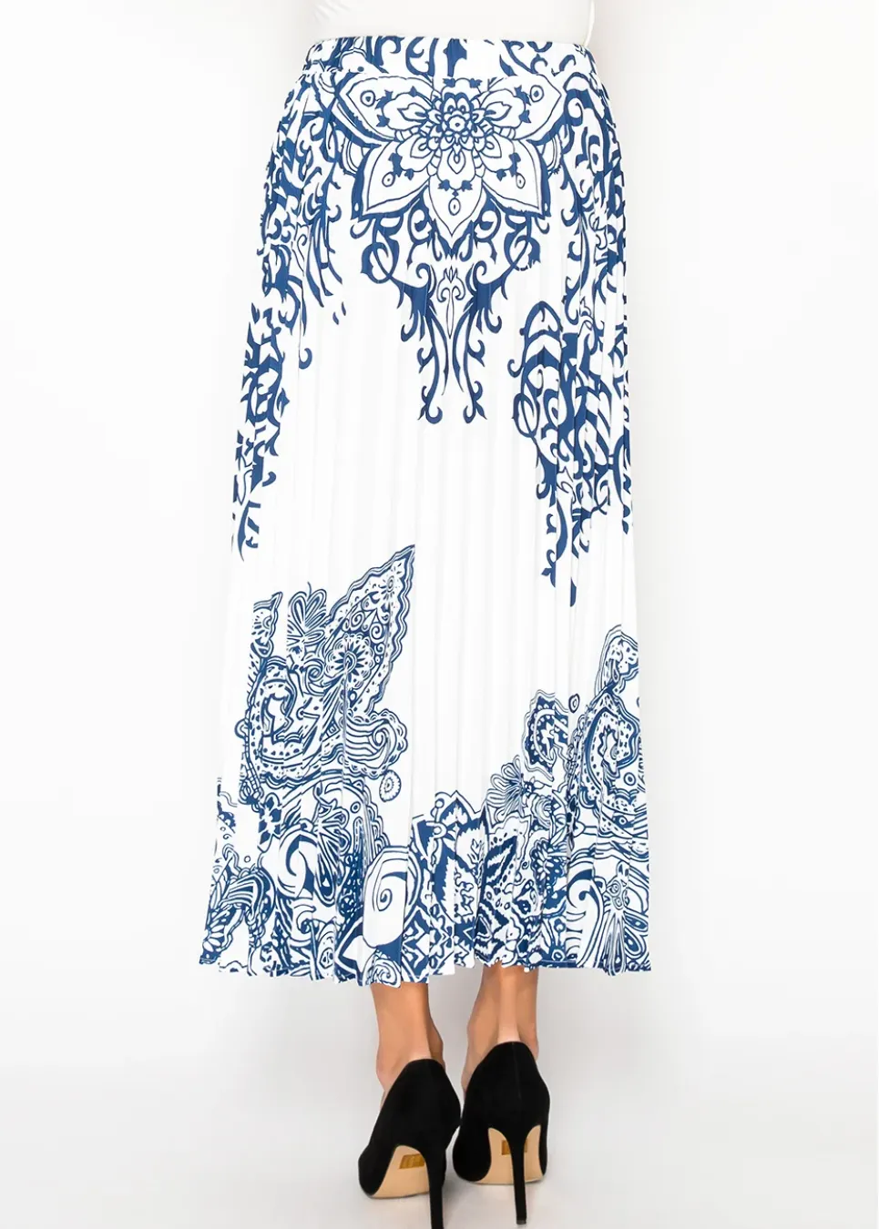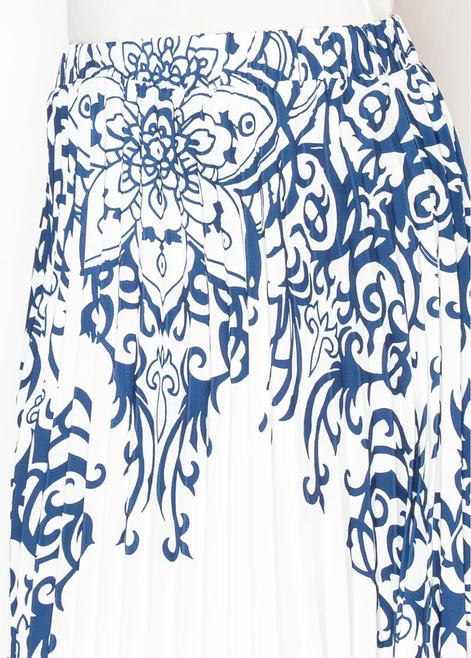 This skirt has a delicate, porcelain-inspired pattern that gives it a classic yet modern feel. The soft pleats add volume without bulk, creating a flattering silhouette that moves beautifully with you.