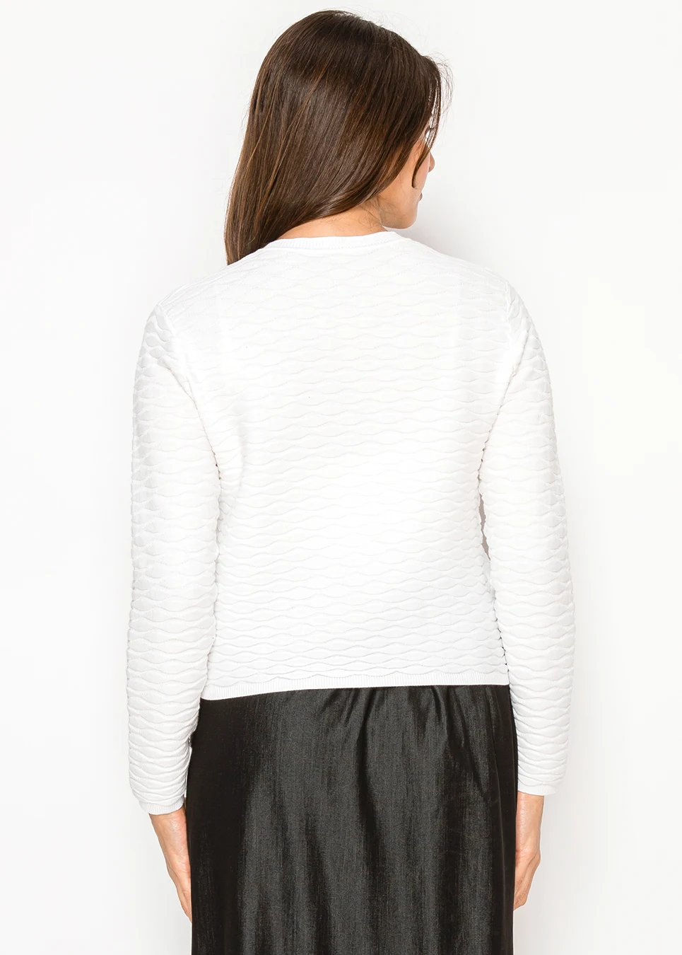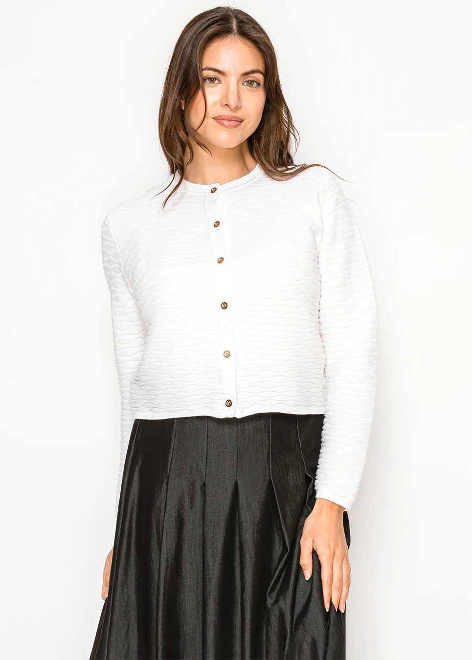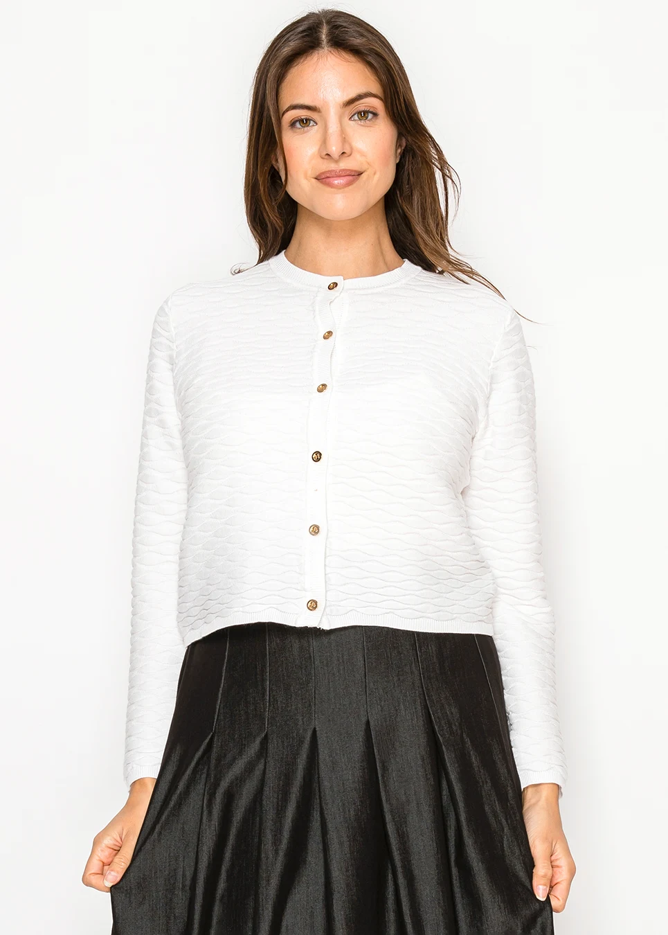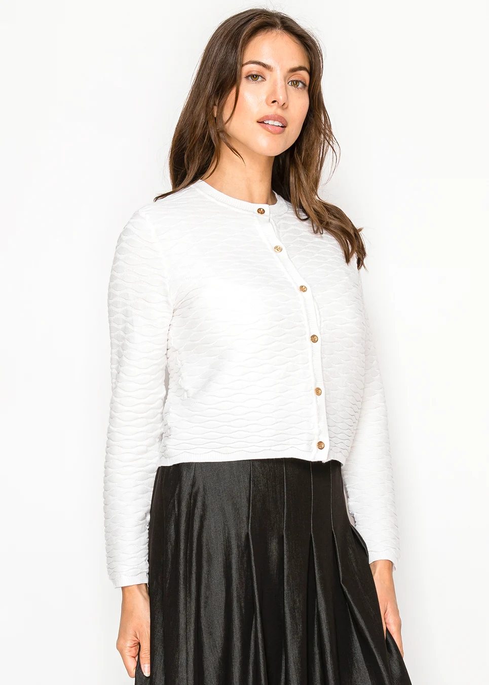 This cardigan does something a plain white layer can't: it has presence. The raised wave knit creates shadow and depth across the entire piece, while the gold button placket adds a polished finish. Cropped length, crew neck, fitted silhouette. The kind of layer that upgrades everything underneath it.