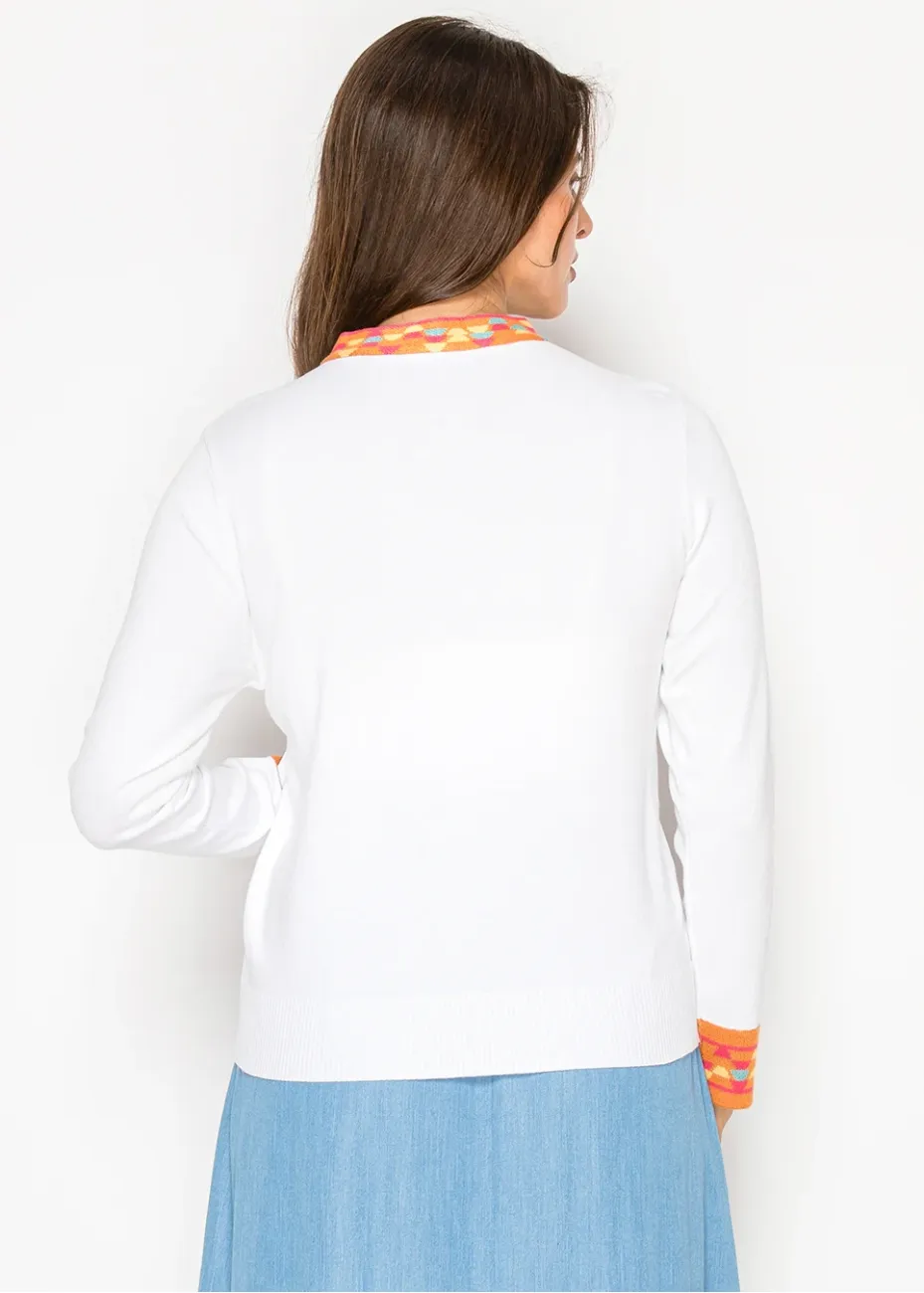 An elevated essential that blends simplicity with craftsmanship. The woven color detail feels intentional and polished, turning a classic white sweater into something quietly luxurious.