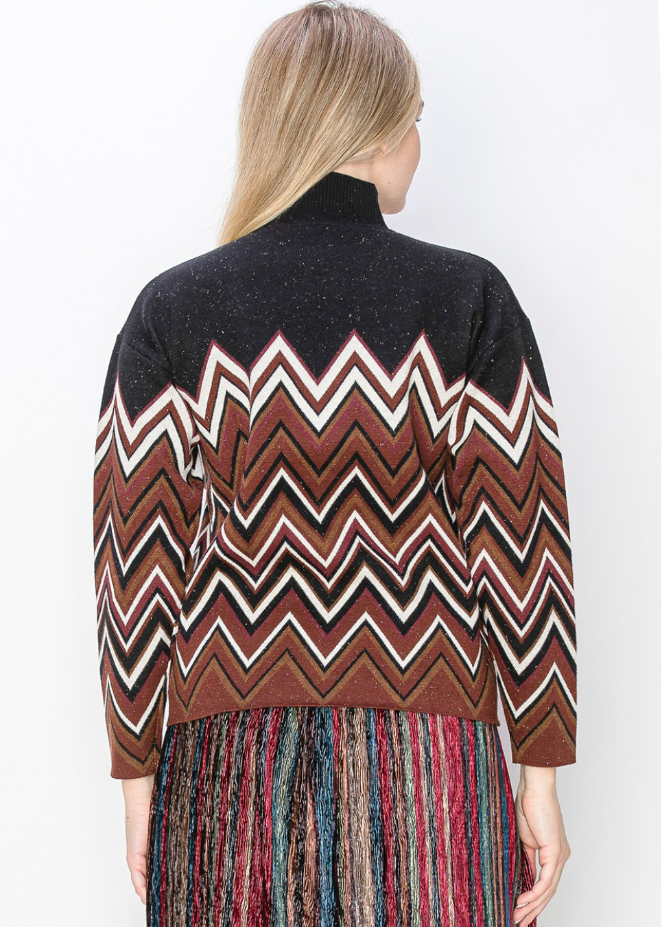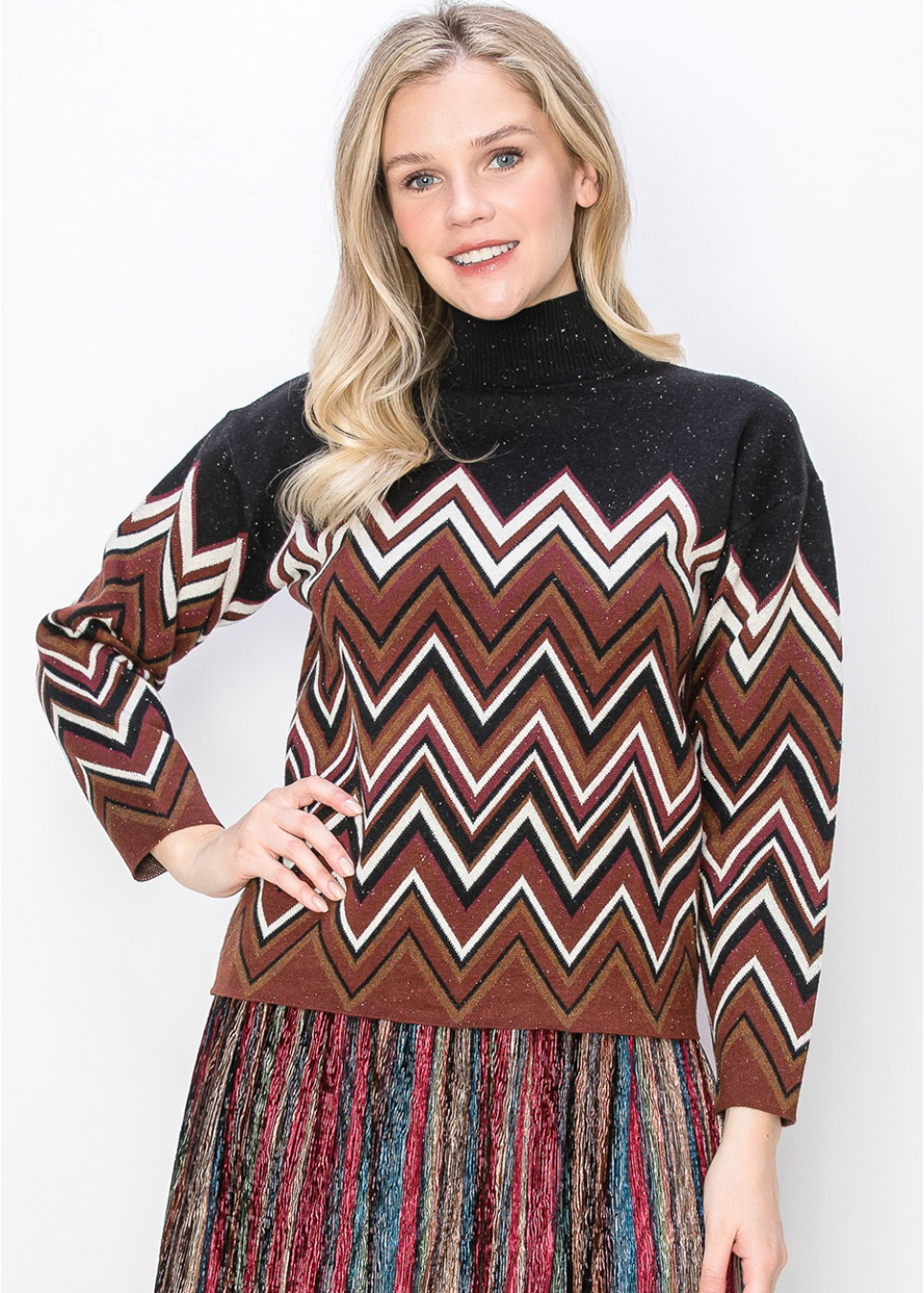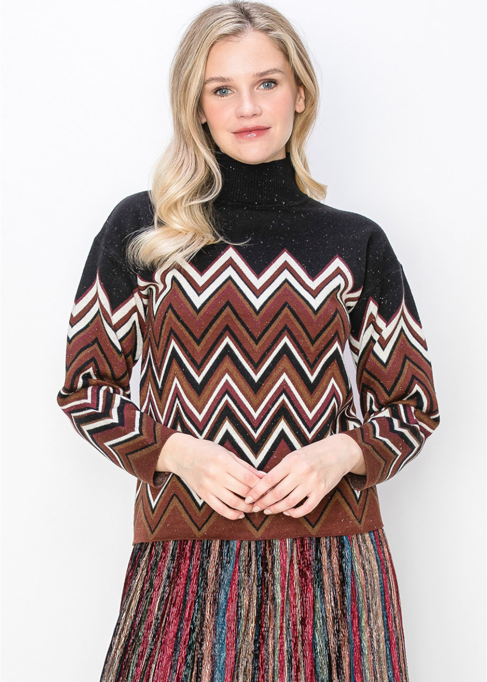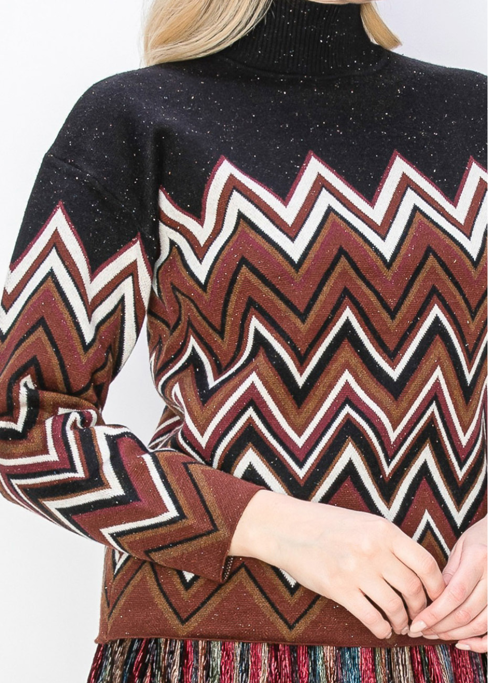 Bold and modern, this chevron-patterned sweater features rich autumn colors with a turtleneck to keep you warm. The mix of burgundy, black, and cream adds a striking contrast, making it a standout piece for those chilly days while maintaining a modest fit.
