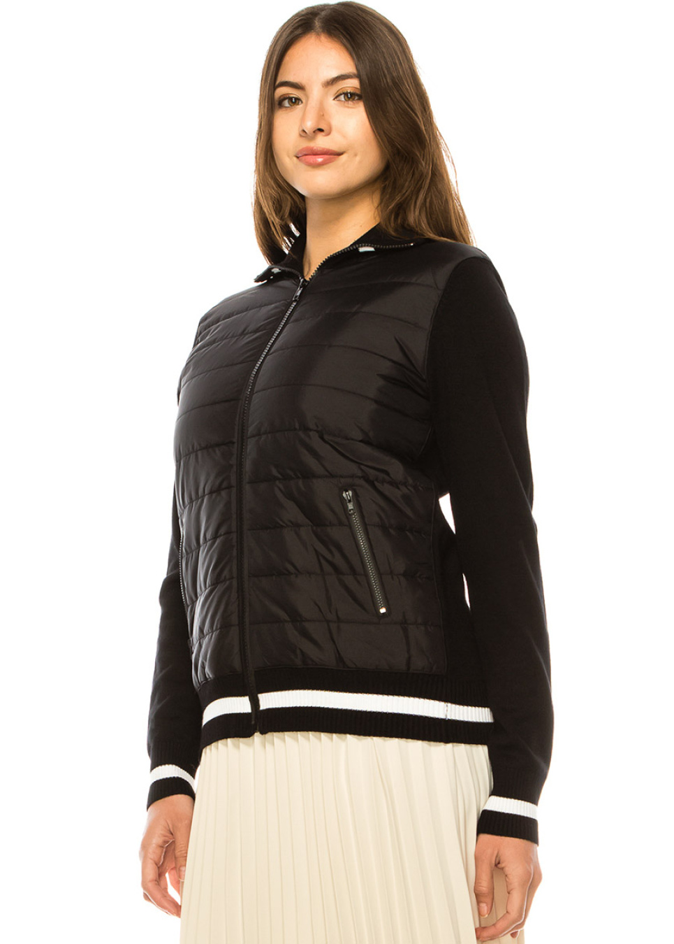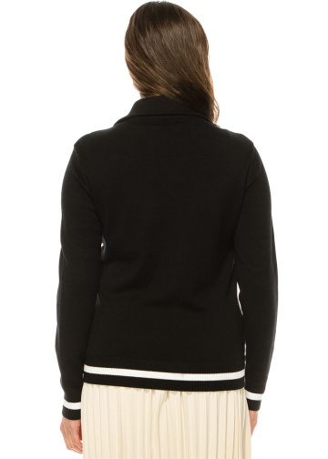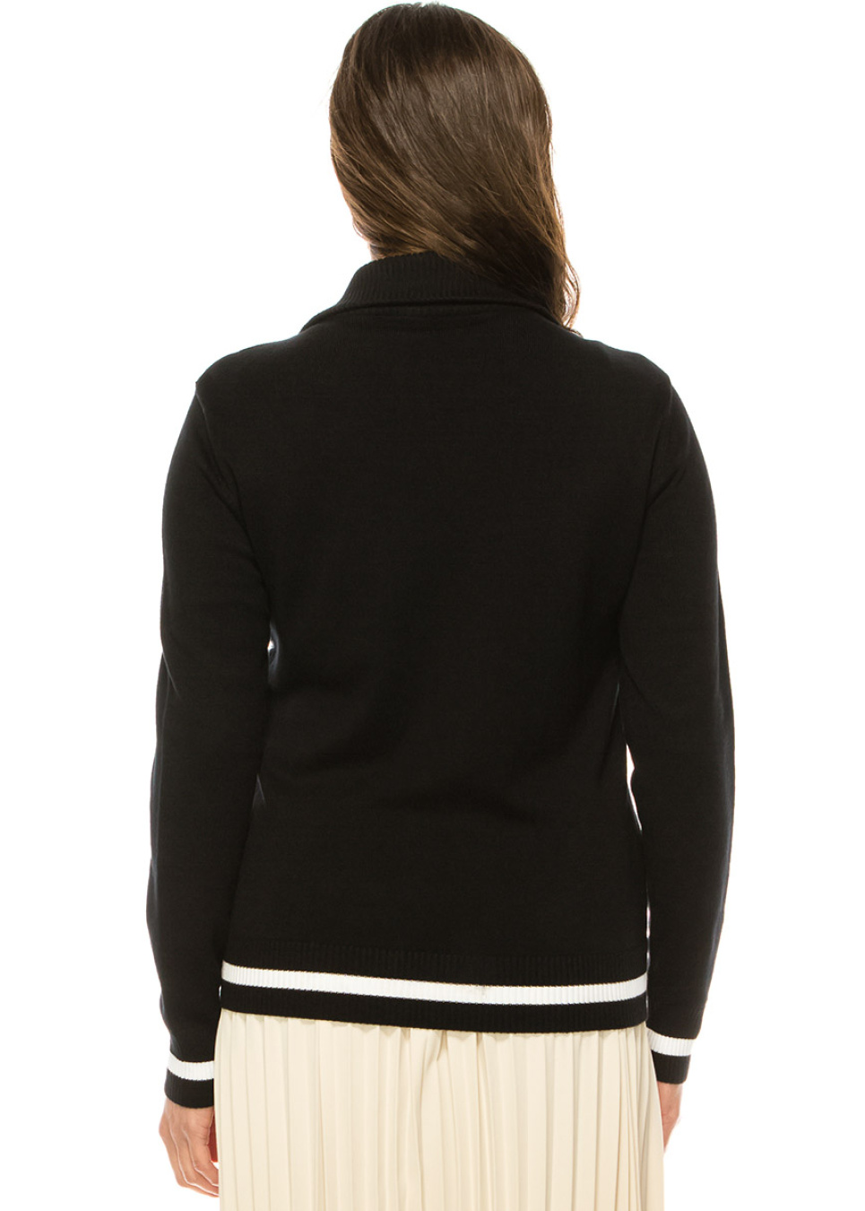 Stay comfortable and stylish with this practical zippered cardigan that keeps you warm during the colder months. The horizontal rows and all-black design create a sleek and versatile look that's perfect for any fall uniform. The white stripes on the cuffs and hem add a unique touch of detail to this classic piece. Whether you're running errands or going out, this cardigan is the perfect choice for both comfort and style.