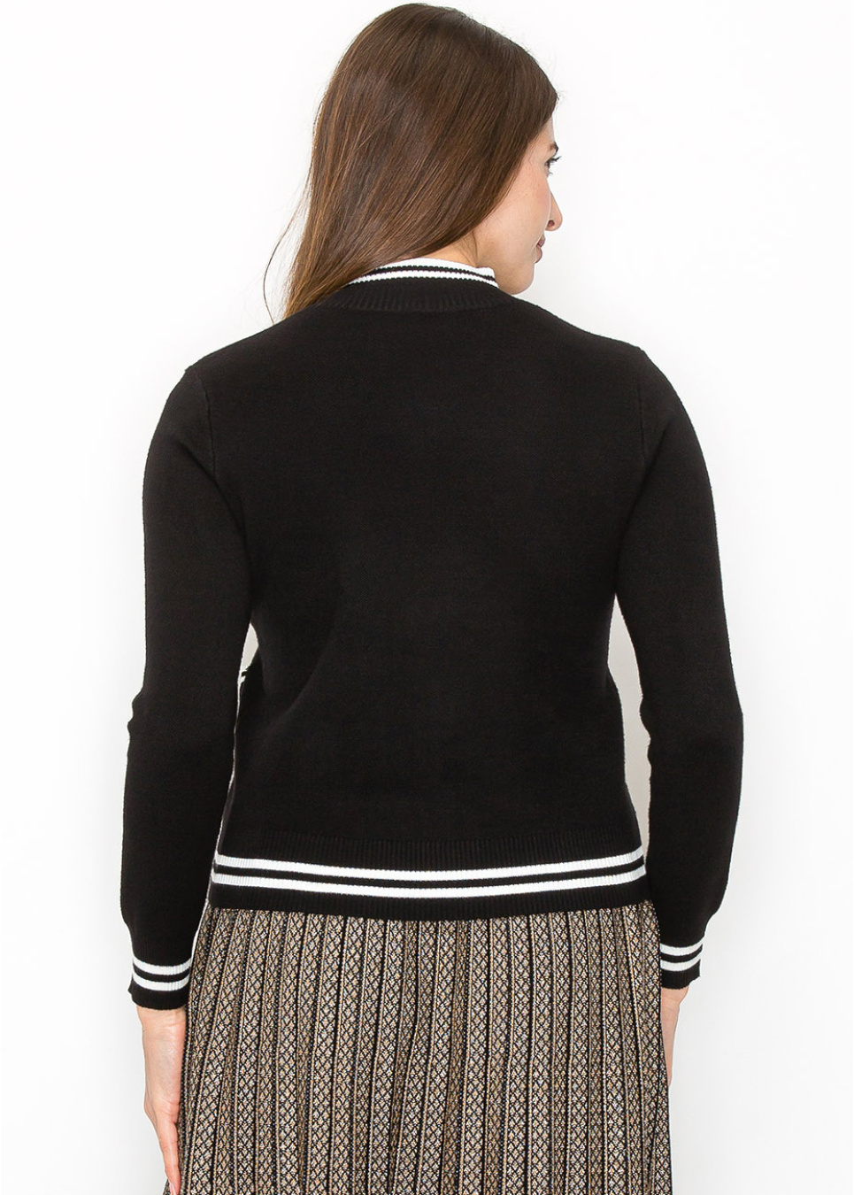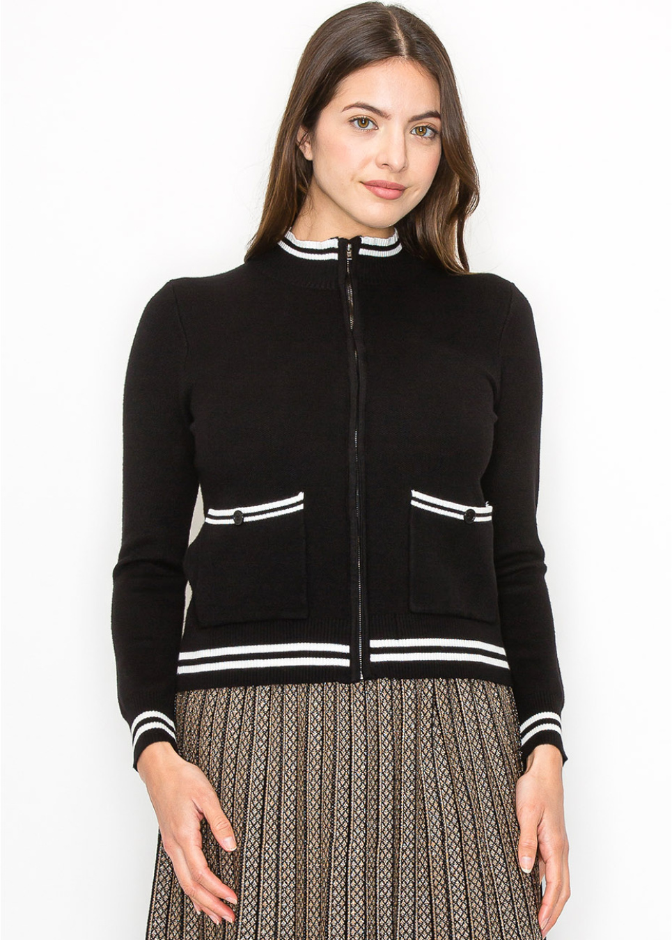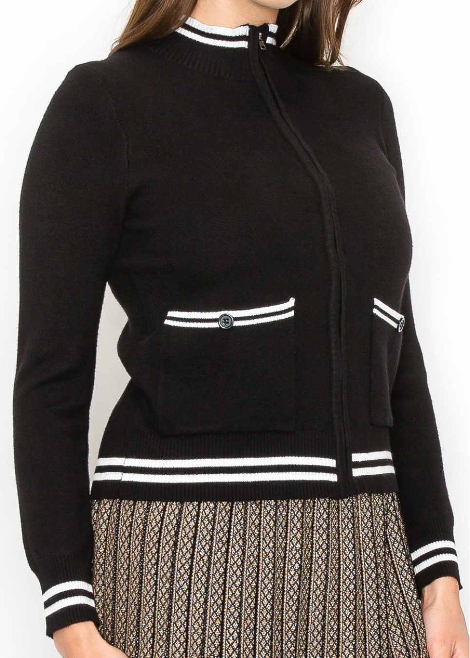 With its zip-up front and clean lines, this black cardigan brings a contemporary edge to your wardrobe. The white stripes at the hem and cuffs add a subtle contrast, while the pocket details lend a touch of functionality. It’s an effortless way to stay warm and stylish.